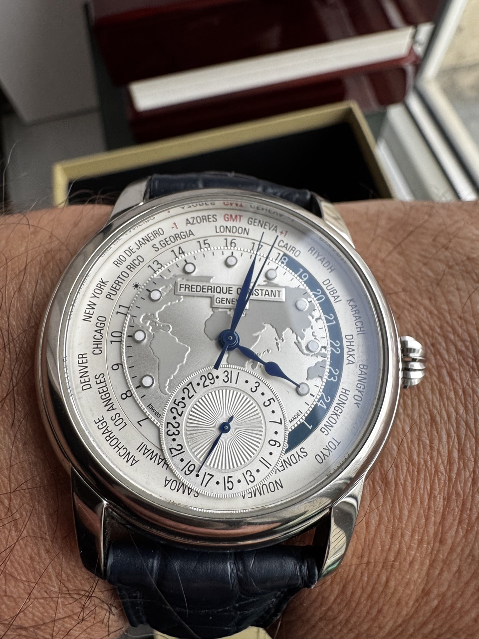 В продаже культовые Frederique Constant Manufacture Worldtimer FC-718WM4H6, представлен в полностью полированном корпусе из нержавеющей стали, диаметром 42 мм, толщина составляет 12,25 мм, ширина 45,25 мм, включая заводную головку. Циферблат защищен слегка изогнутым сапфировым стеклом и плоским сапфиром на задней крышке. Стальная заводная головка имеет выступающие ребра, полностью отполирована, имеет размер около 6,22 мм и не имеет блокировки. Она управляет всеми функциями: часами, минутами, датой и шкалой мирового времени. Собственный калибр FC-718 — механизм с автоподзаводом, с частотой 4 Гц, 26 камней, запас хода 42 часа, очень красиво отделан перлажем на основной платине и круговым узором Côtes de Genève на основном мосту