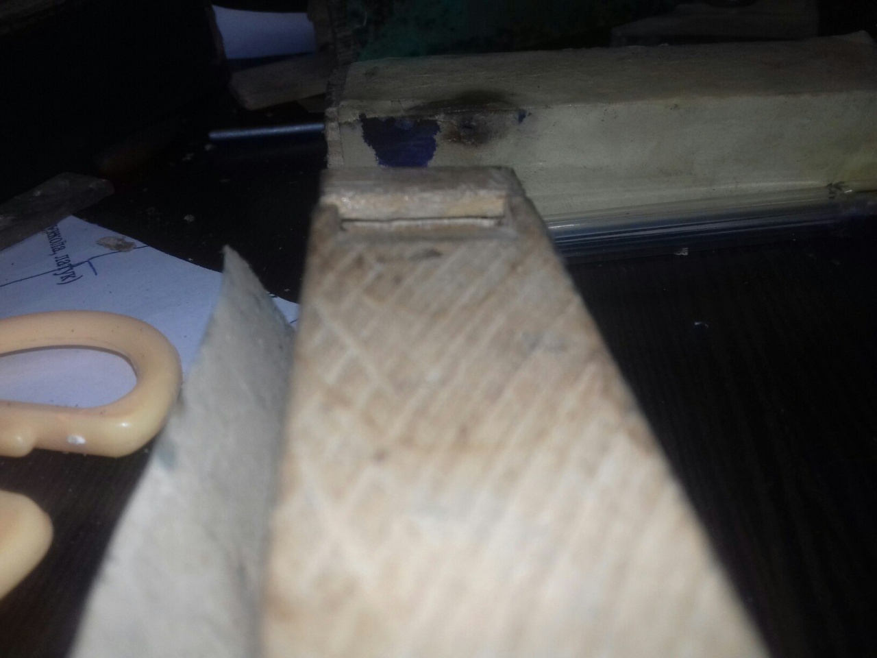 Для этого обе планки складываются вместе и между ними, параллельно длинным сторонам помещается футик. Плоский торец футика располагается заподлицо с плоскотью торца блока. Блок из сложенных планок и футика крепко стягивается парой резиновых колечек.