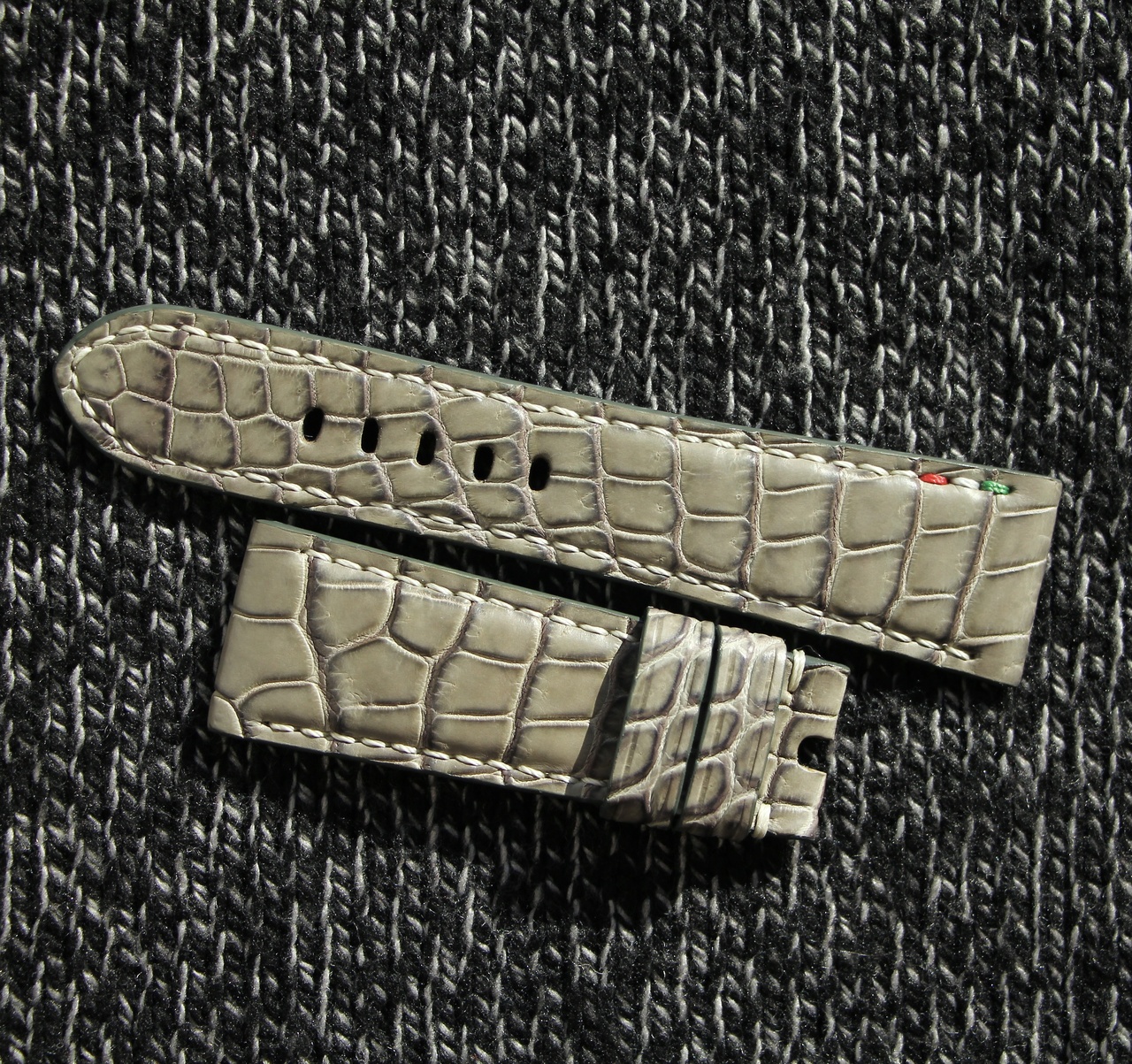 Серо-зеленый крок с темными прожилками. Светлая контрастная прямая строчка. Цвет нити – ангора, толщина нити 0.55 мм. Акцент в виде итальянского флага у основания длинной части. Ширина 26/22 мм, длина 125/75 мм, толщина около 3,5-4 мм, с подиумами, мягкий. Подклад - черная коза, края окрашены полиуретановой краской в цвет. Выделка лица и подклада - Италия. Две шлевки, подвижная и вшитая.