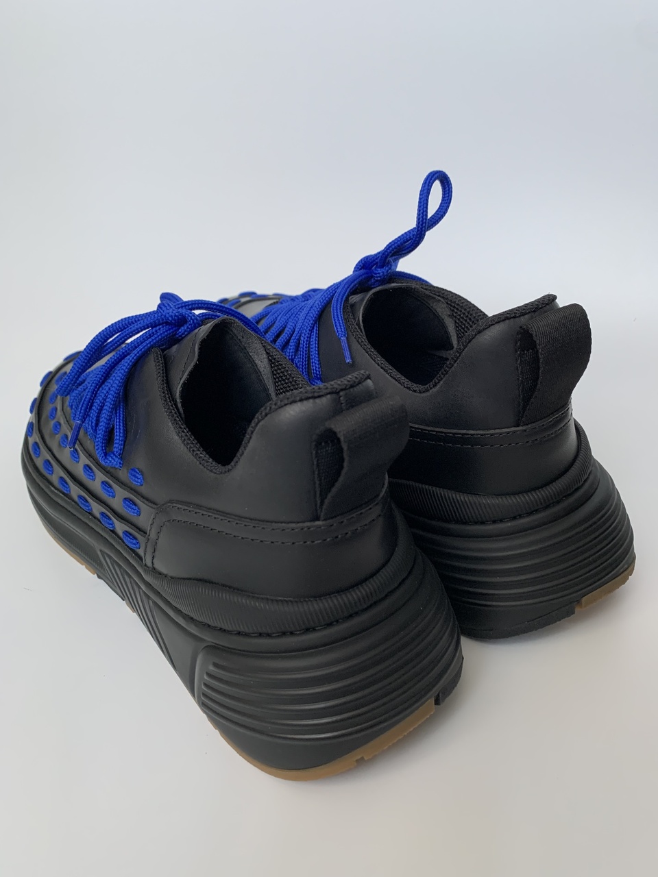 Чёрные кроссовки не выглядят просто благодаря шнуровке оттенка синий электрик и двойному стичингу ей в тон.Обувь изготовили из гладкой матовой кожи растительного дубления,поэтому она получилась особенно мягкой и эластичной.