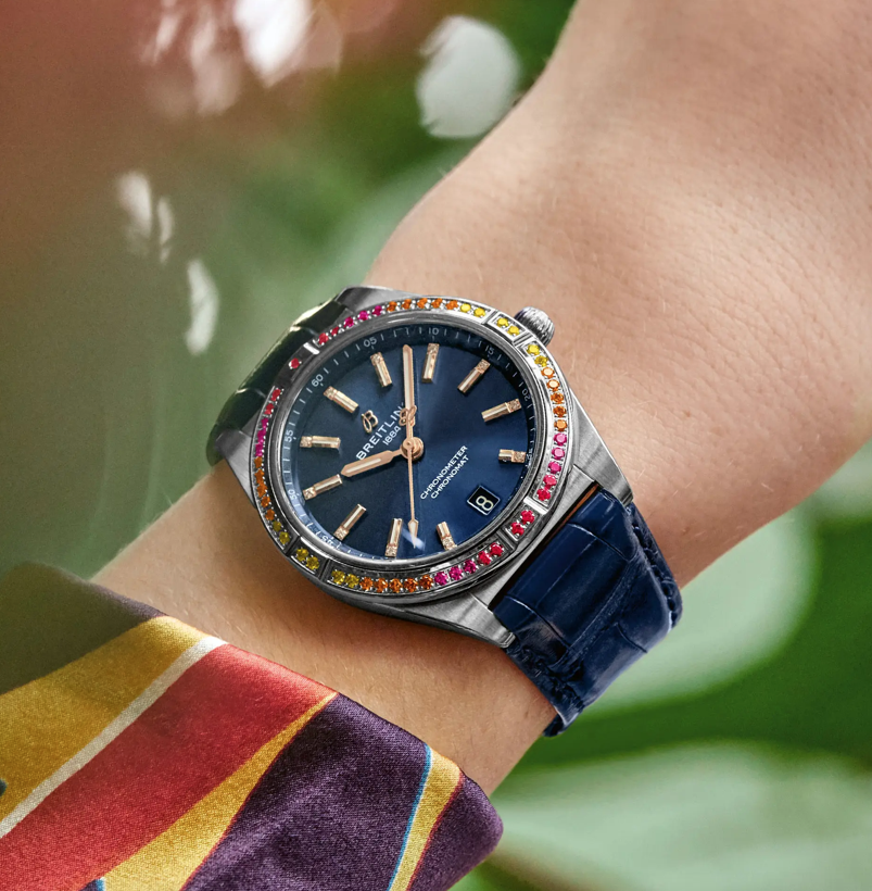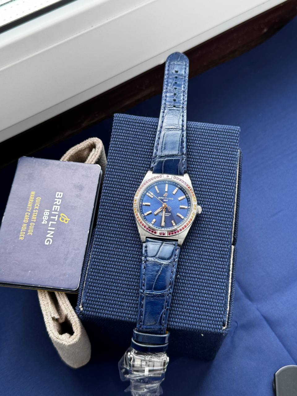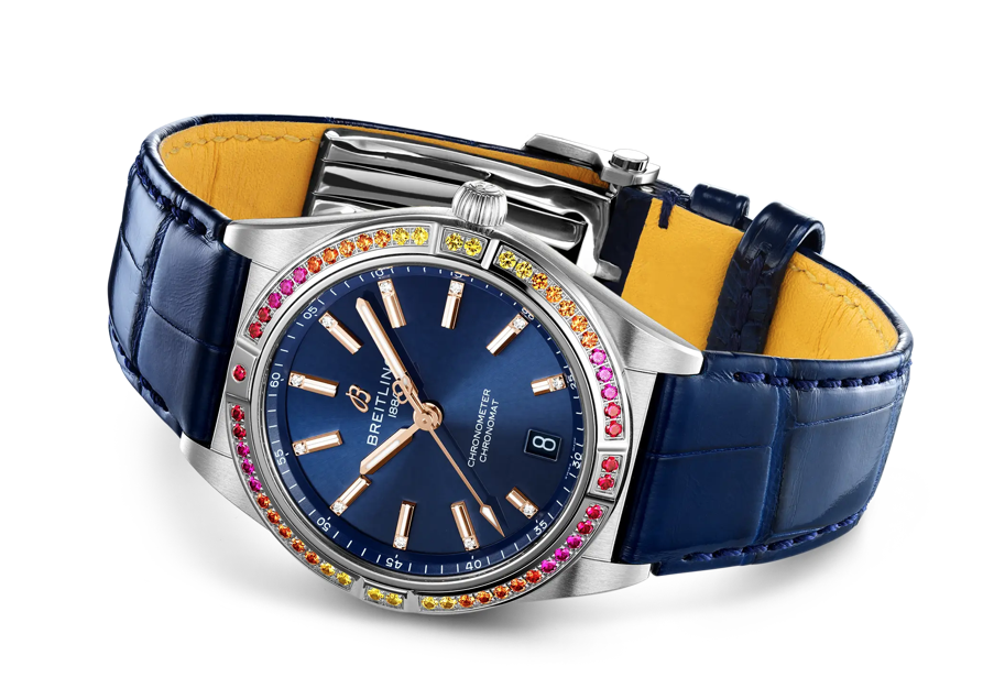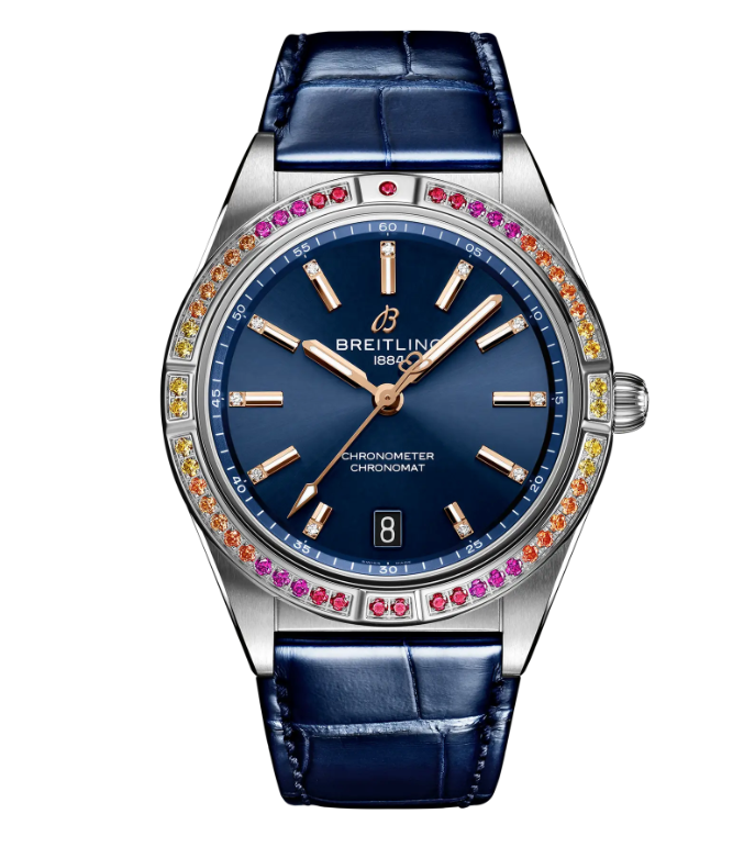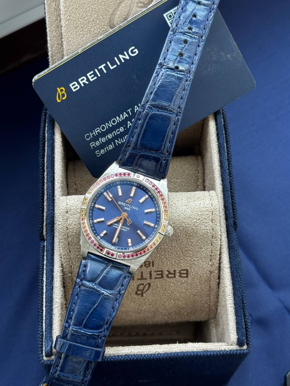 РЕДКИЕ ЖЕНСКИЕ *BREITLING* CHRONOMAT AUTOMATIC 36 ММ SOUTH SEA Ref: A10380611C1P1/СИНИЙ ЦИФЕРБЛАТ/БРИЛЛИАНТЫ НА ЦИФЕРБЛАТЕ/РАЗНОЦВЕТНЫЕ ДРАГОЦЕННЫЕ КАМНИ НА БЕЗЕЛЕ