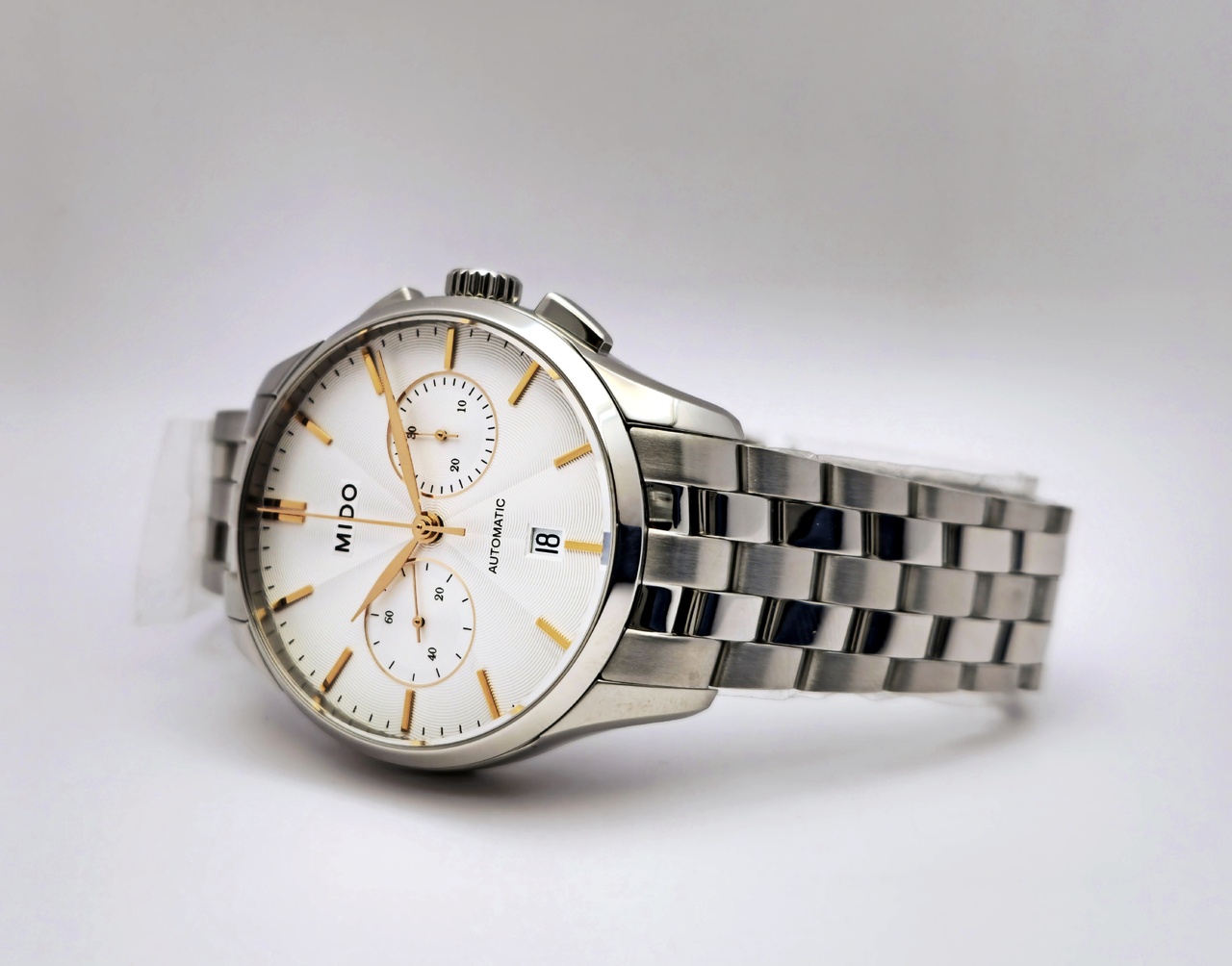 В этом элегантном хронографе соединилось все лучшее, чтобы радовать ценителя классики каждый день. Мужские наручные часы MIDO Belluna II - это часы-хронограф с секундомером в стальном 42мм корпусе. В швейцарском автоматическом механизме 27 камней, частота 28800 полуколебаний в час, запас хода до 60 часов. Гильошированный светло-серебристый циферблат с накладными золотистыми метками в виде штрихов. Окошко даты. Рифленая заводная головка. Прозрачная задняя крышка. Стальной браслет с раскладывающейся застежкой.