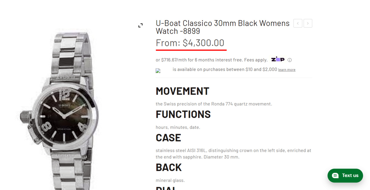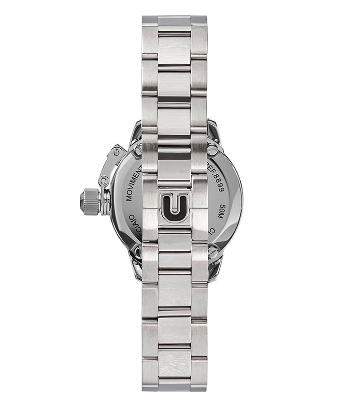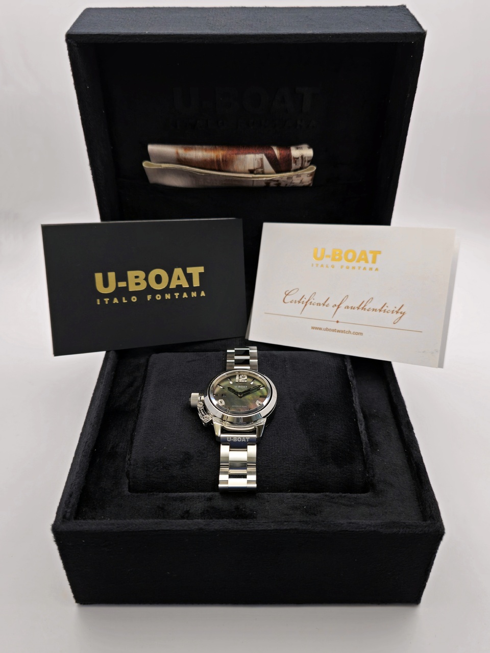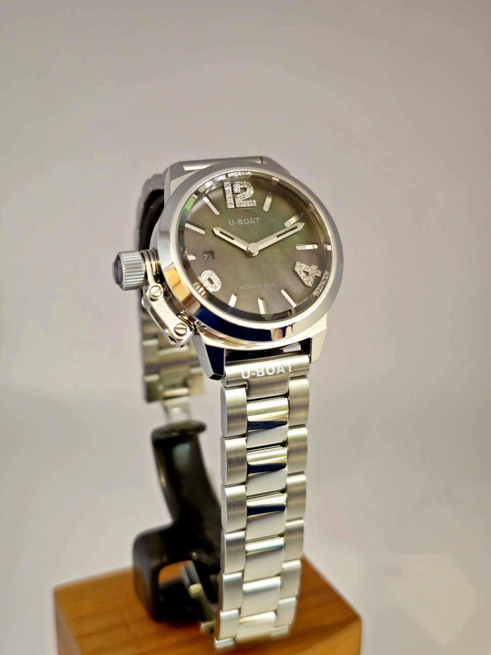 В продаже очаровательные женские часы U-Boat Classico в универсальном размере корпуса 30мм в диаметре с бриллиантовыми накладными цифрами и датой на перламутровом циферблате. Эти женские спортивные часы также оснащены левой заводной головкой, отличительной чертой часов U-Boat. Часы оснащены браслетом из нержавеющей стали с раскладывающейся застежкой, а также прочной задней крышкой, которая закрывается четырьмя внешними винтами, под которыми находится швейцарский кварцевый механизм не требующий постоянной заводки.