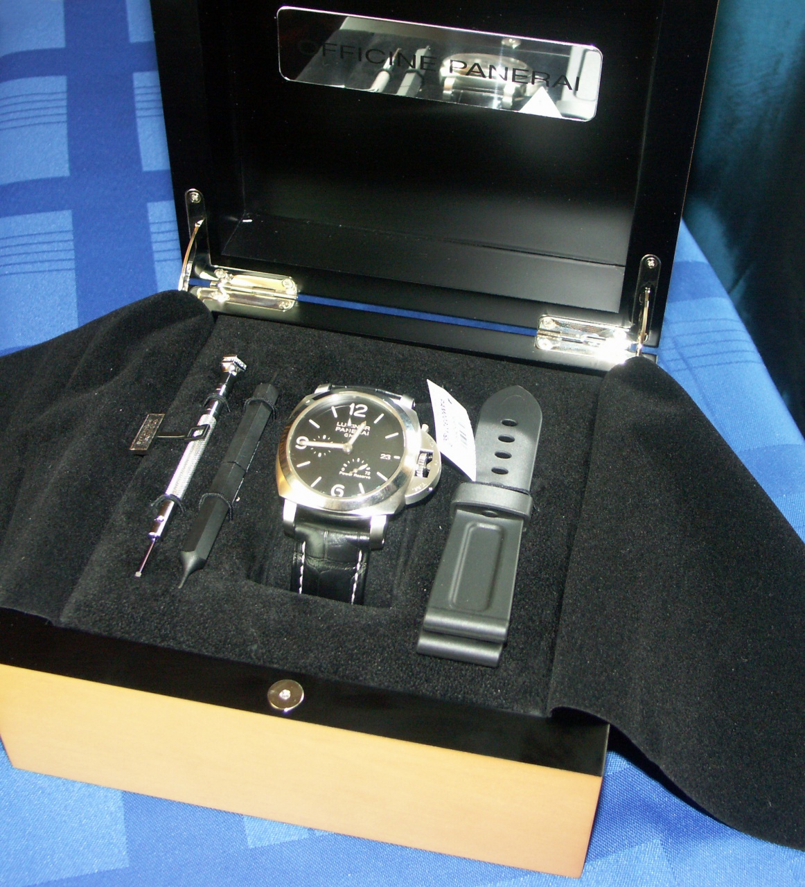 Шкатулка – просто именины души, праздник сердца! Сверху безукризненно-деревянное, внутри – угольно-черное, блестящие петельки, сверкающая мемориальная табличка с «OFFICINE PANERAI»… Полный разврат и эякуляция. А уж когда внутри обнаружились и часы – радости вообще не было предела. Мало того, что красота такая, так еще и часы впридачу! Ну, естественно, отверточка, пластиковая тыкалка для смены ремешка, запасной ремешок.
