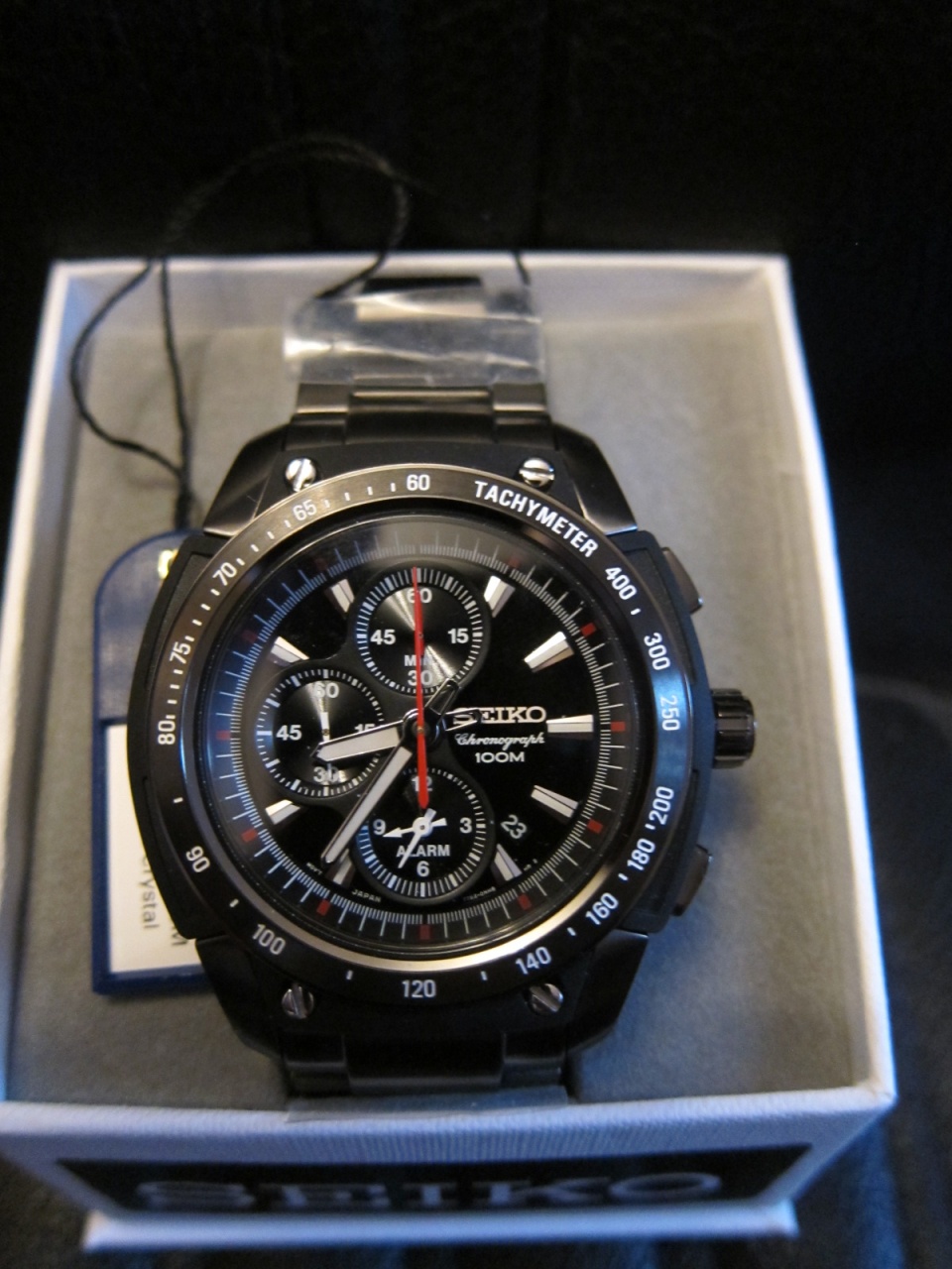 Часы-хронограф с секундомером и тахиметром. Секундомер до 60 мин и точностью 1/5сек. Тип механизма: кварцевый. Калибр 7T62. Корпус: сталь с PVD покрытием. Циферблат: черный. Браслет: стальной с PVD покрытием; Водозащита: 100WR. Подсветка: люминесцентные стрелки и метки; Звуковой сигнал: будильник. Стекло: минеральное повышенной прочности. Календарь: число. Размер: 43х43х10 мм.
