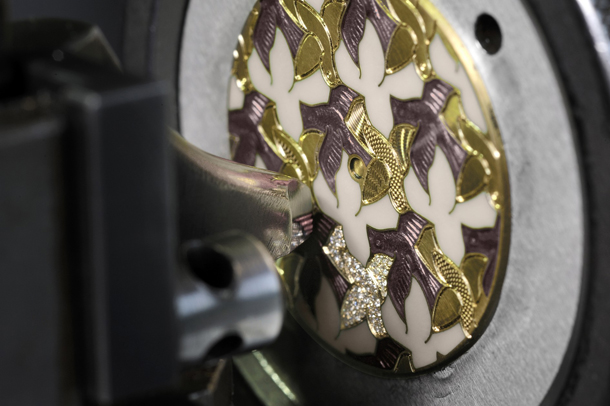 Первым за дело берется гравировщик, который на основе циферблата из желтого золота намечает контуры голубей, после чего гравирует изображение, подготавливая его для эмальера под роспись по технике шамплеве. Эта кропотливая работа требует бесконечной сосредоточенности и точности, так как самовоспроизводящаяся симметрия композиции не должна содержать ни единого изъяна.