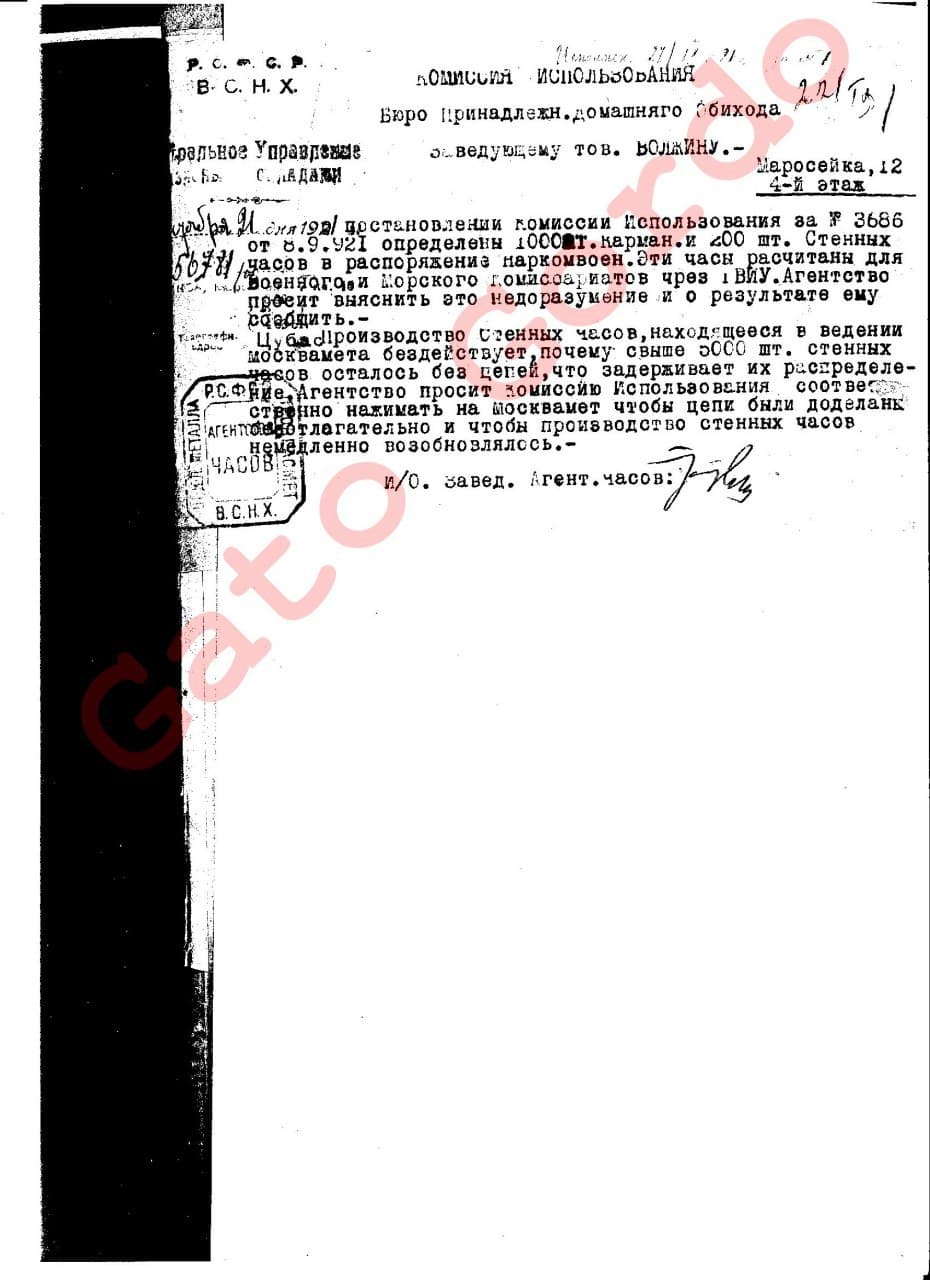 Последнее изображение - документ из переписки Точмеха (в 1921г - Агенства часов Комитета продажи и распределения металла (Продрасмет) Отдела металла ВСНХ РСФСР) с одной из структур контроля местной промышленности Москвы. В тексте Точмех пеняет на недопоставки часов, в т.ч. 1000шт. карманных "для Военного и Морского комиссариатов через ГВИУ".