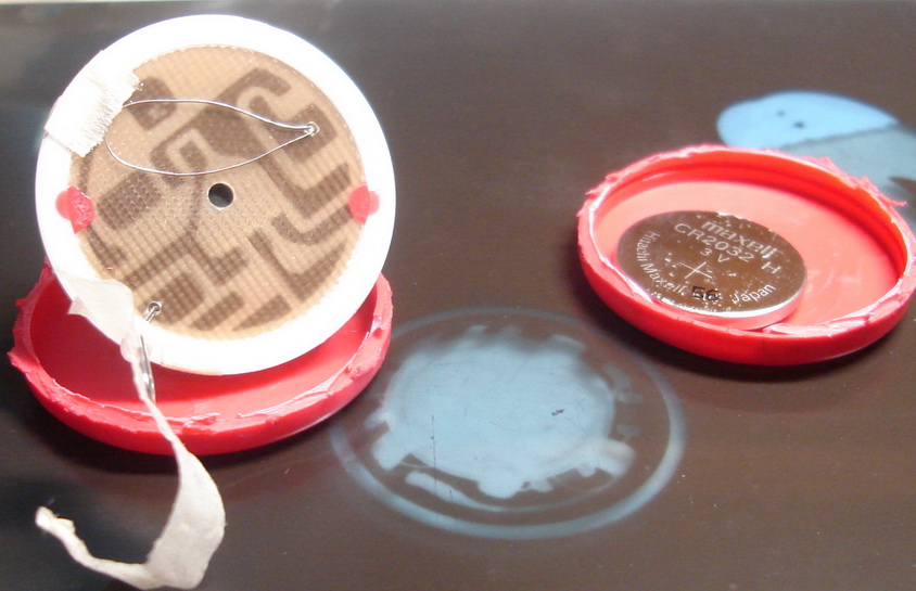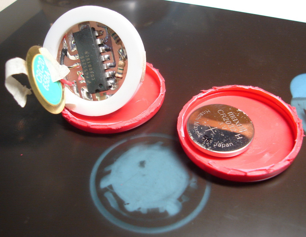 вскрытие показало следующую картину.трёхвольтовая батарейка,звуковая мембрана и микросхема,кустарная пайка.