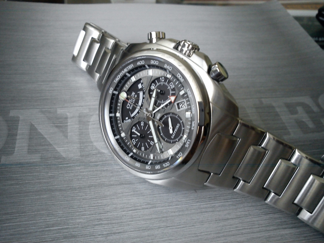На днях приобрел себе вот такой Citizen. Часы сделаны очень качественно, с вниманием к деталям. На руке сидят комфортно, достаточно тяжелые, давно хотел часы на браслете,до этого был Скайхок на каучуке, летом не очень комфортно было. Идут вроде бы точно, за пару дней наблюдений не ушли ни на секунду, дальше посмотрим. Вот только заряд че-то на одном месте, не повышается, может солнца мало еще....