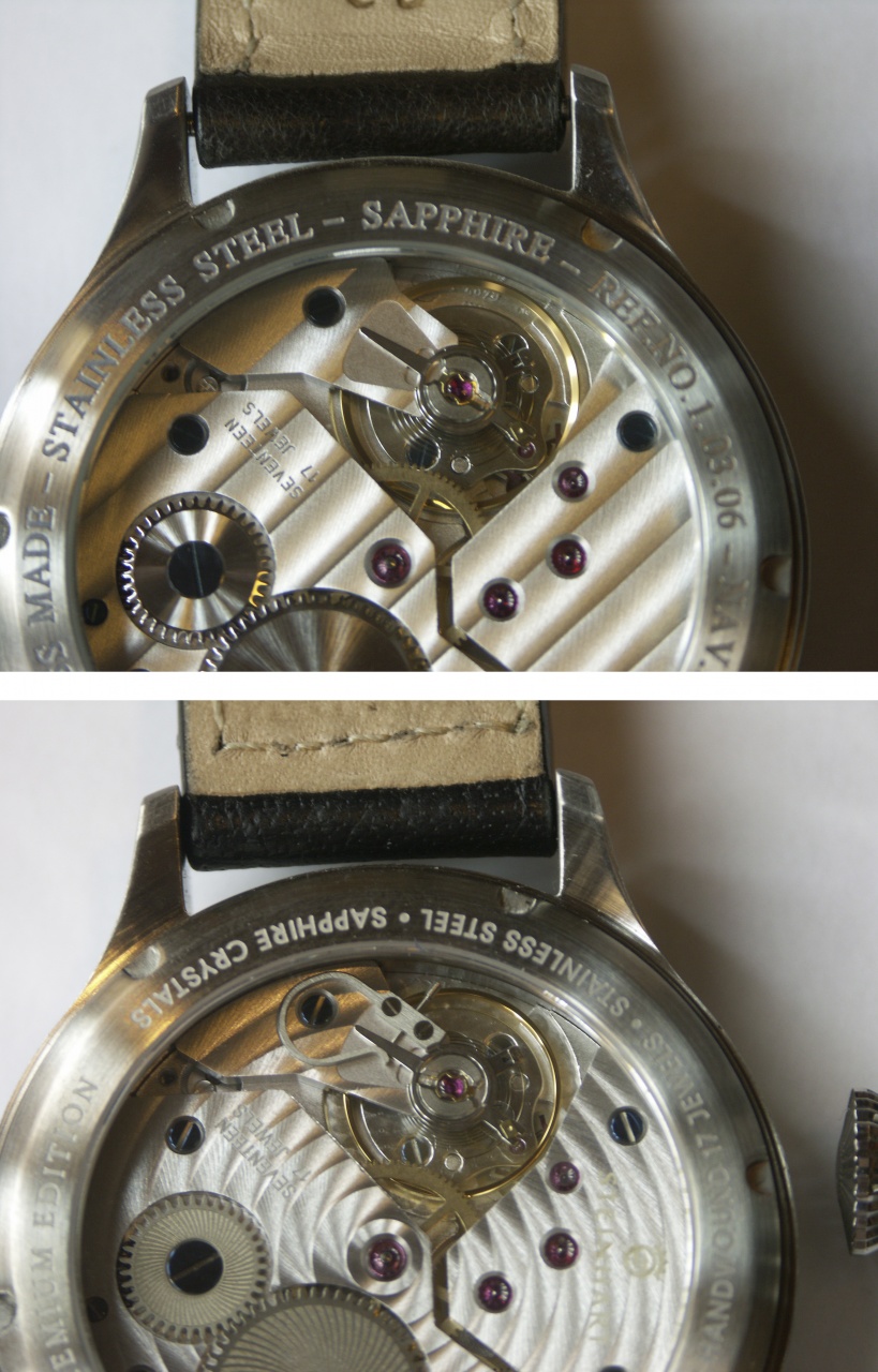 13. И, основное отличие – надпись STEINHART, высусленная на механизме. На сайте она смотрится довольно бодро, даже написано, что надпись сделана золотом. В жизни выглядит не очень. Видимо, когда писали мне, золотые чернила заканчивались.