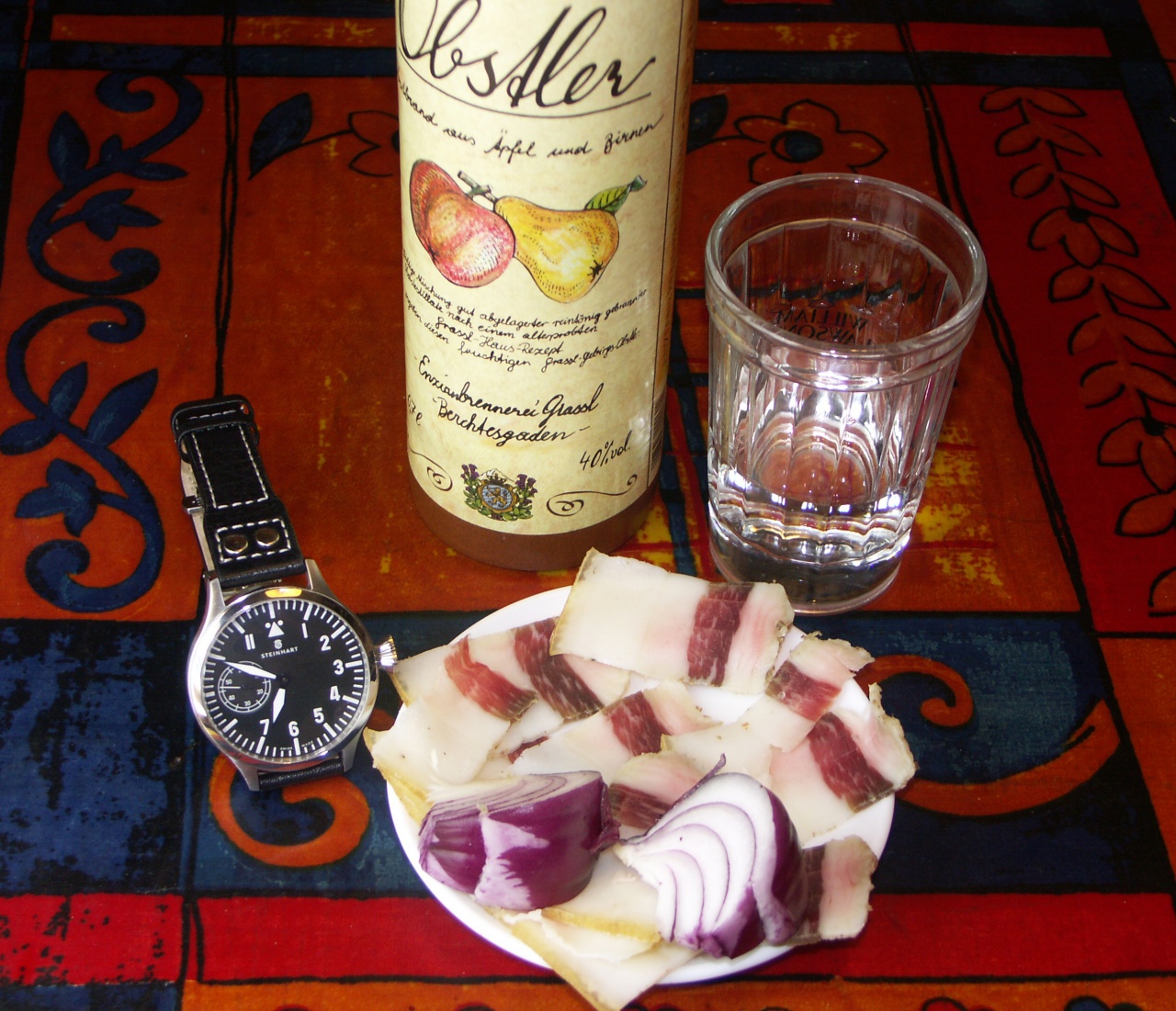 В качестве обмывочной жидкости выбран домашний яблочно-грушевый шнапс в глиняной бутылочке.