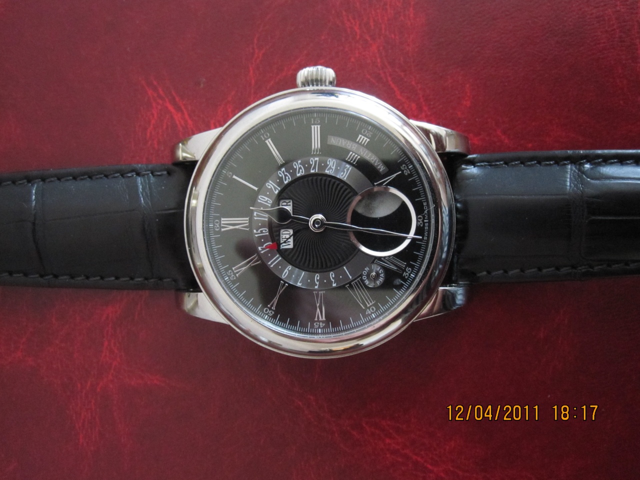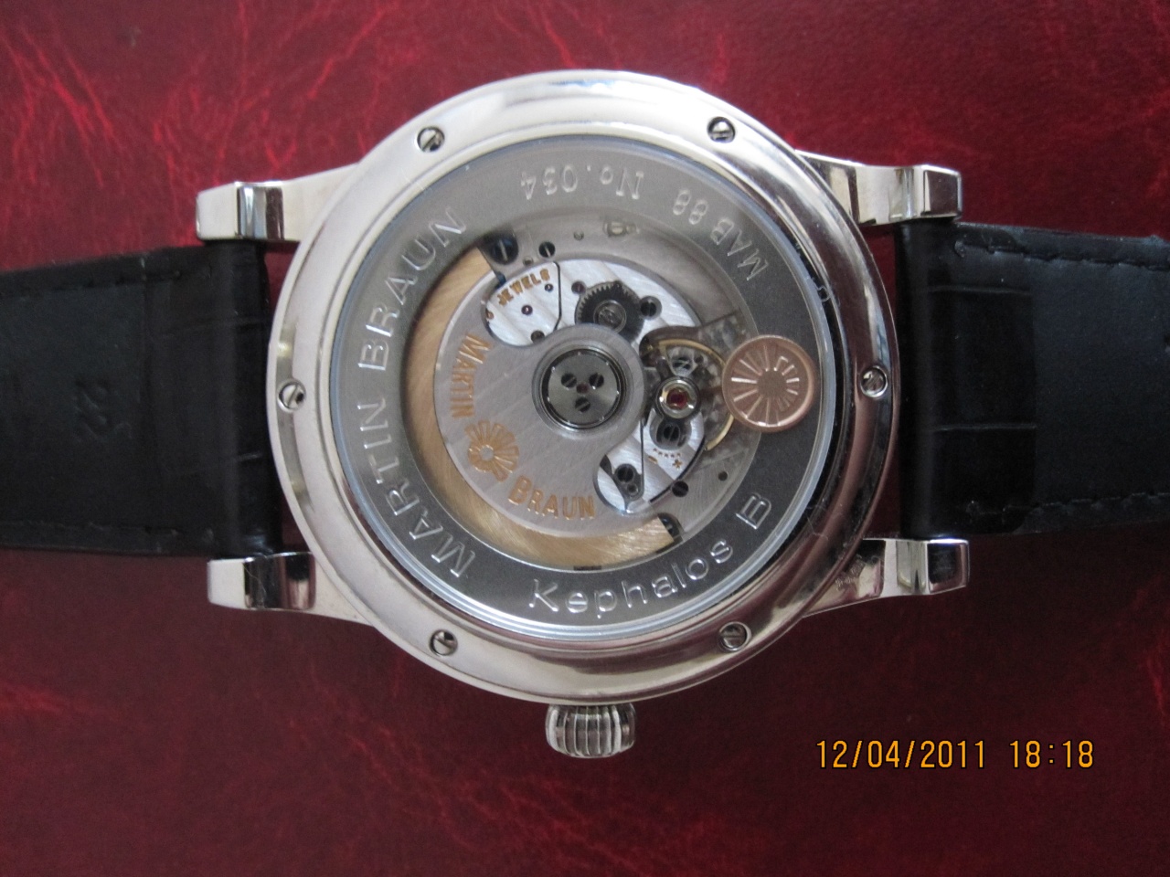 Эксклюзивные часы, порядковый № 034. Автоматический механизм, Калибр МАБ 88. Диаметр -44.5мм. Запас хода 42 часов. Частота 28,800 полуколебаний в час, 25 драгоценных камней. Сапфировое стекло. Прозрачная задняя крышка. Водонепроницаемость 50 м. Вышитый вручную ремешок из кожи крокодила, с выгравированным логотипом Мартина Брауна. Функции: часы, минуты, дата, фаза луны. Точность отображения "большой" лунной фазы такова, что отклонение всего в одни лунные сутки всплывет только после непрерывного ношения часов в течении 122 с половиной лет! Это единственные часы в мире, где лунный диск движется не пошагово, а плавно и может быть откорректирован с точность до минут!