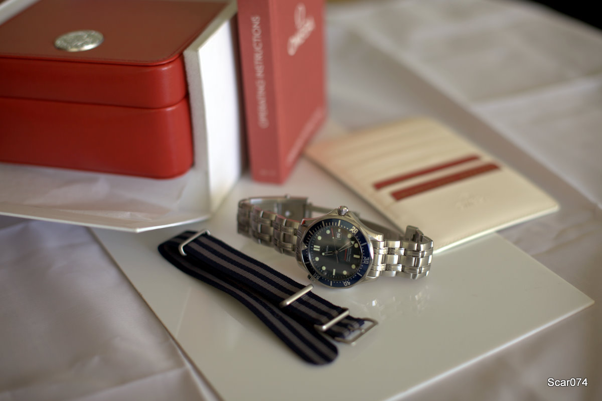 В комплекте кроме полного комплекта документов и коробок, снятые звенья и новый тканевый серо-синий ремешок G10 NATO 22мм.