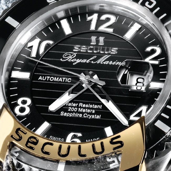Новая модель Royal Marine от швейцарской часовой компании Seculus, представленная на завершившейся на прошлой неделе международной выставке Baselworld-2012, имеет круглый корпус из нержавеющей стали, диаметром 48 мм, водонепроницаемый до 200 метров. Вращающийся однонаправленный дайверский безель с черным покрытием; защищенная завинчивающаяся заводная головка на 3 часах. Между нижними дужками корпуса имеется накладная пластинка (позолоченная или не позолоченная) с наименованием бренда. Сапфировое стекло, с увеличительной линзой на 3 часах, защищает черный циферблат с накладными арабскими цифрами, часовыми индексами, часовой и минутной стрелками, покрытыми белым люминесцентным составом. Циферблат декорирован горизонтальными полосками.