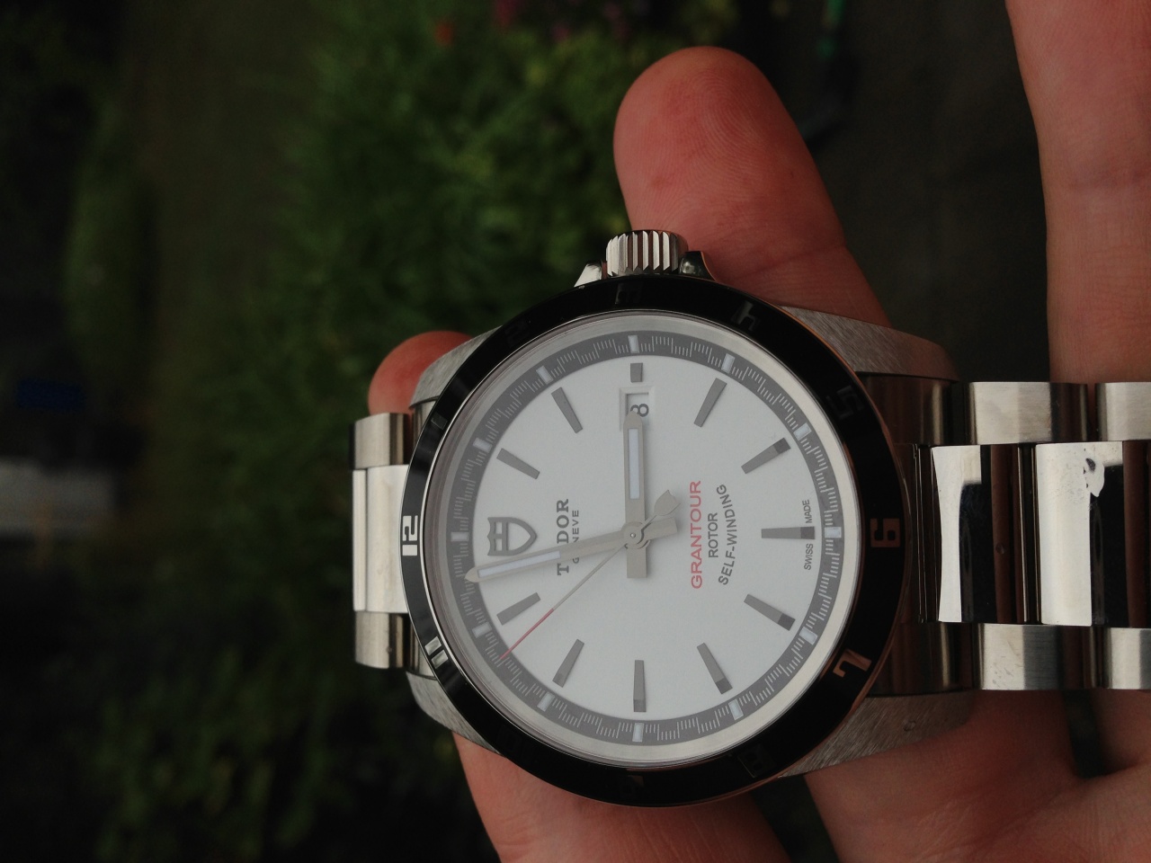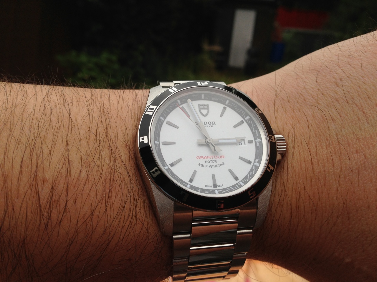 Но сегодня, проходя, мимо Blome, что на Кё в Дюссельдорфе, думаю дай ка зайду и спрошу есть ли в наличии данный Тудор. Хотя, особо не надеялся, но попытка - не пытка. Нас с женой встретил сам мастер, очень приятный и доброжелательный человек. Показал несколько моделей, которые не выставлены на витрине, среди них Грантура не было. Попросив подождать минутку, мастер вернулся с моим Тудором и именно белым, как я хотел. К слову сказать, имея черный Брайт, хотел именно с белым цифером. И тут как раз он, в пленках, ни разу не одеванный, все как надо. Дав скидку в 10% и бутылку Killepitsch, продавец со мной любезно попрощался.