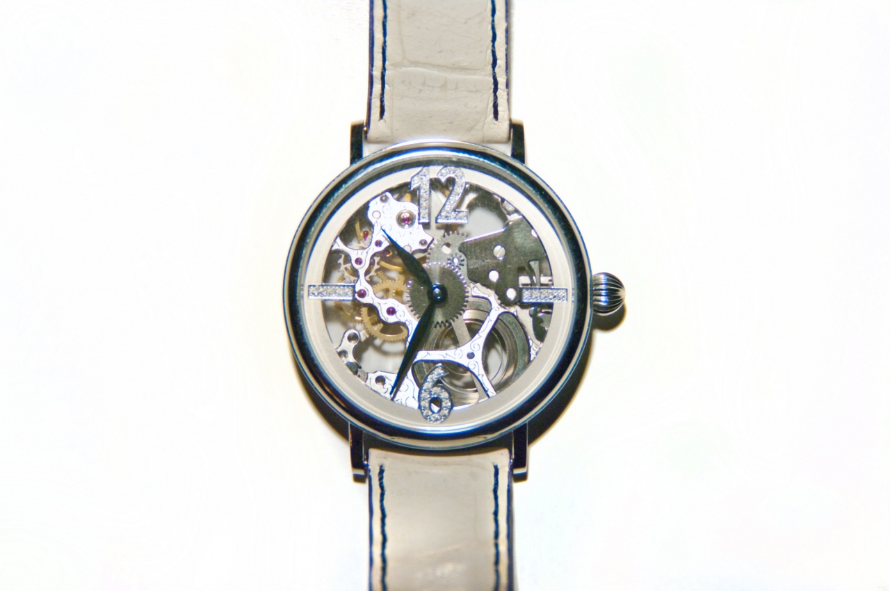 Лимитированная (ограниченная) серия. Специально для женщин. Скелетонизированный корпус - полностью виден весь механизм часов насквозь (прозрачная задняя крышка). Стекло сапфировое, устойчивое к царапинам. Водостойкие (30 атм.). Ремешок из кожи крокодила, белый. Размеры корпуса - 42 мм., толщина - 9 мм. Механизм - швейцарский "Unitas 6498". Циферблат украшен топазами 0,18К.