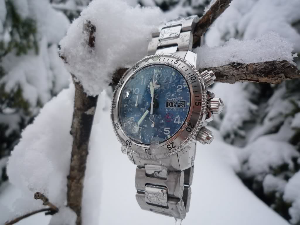 Sinn 203 Arktis. Тут очень понравилась то, что это был хрон и дайвер, фишка с возможностью выносить перепады температур от проруби до сауны, красивый синий цвет циферблата и размер, минусы – толщина в 16 мм и сложность в обслуживании.