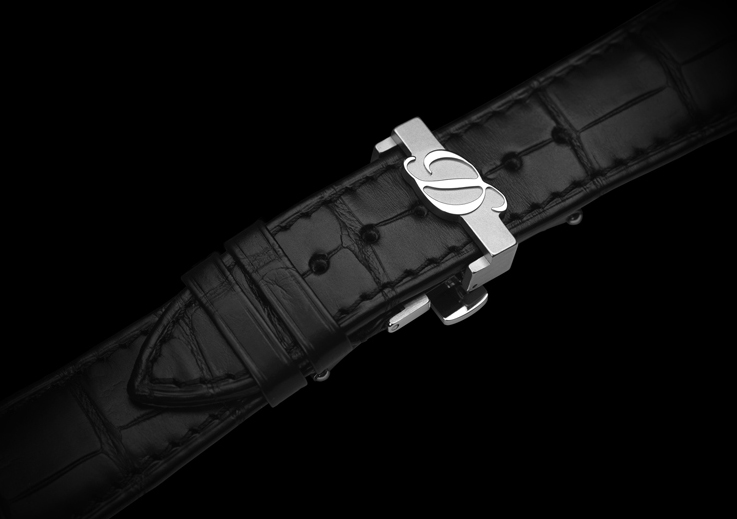 Ремешок часов выполнен из натуральной кожи аллигатора чёрного цвета, со сворачивающейся застёжкой.