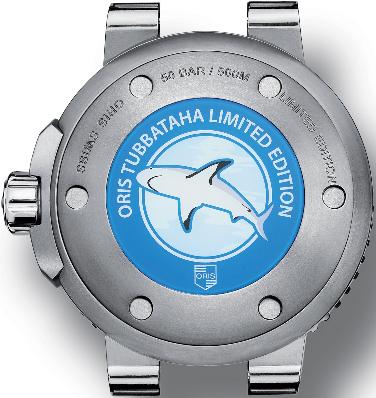 На задней крышке часов Oris Tubbataha Limited Edition изображена акула – этим обитателям рифов Туббатаха грозит вымирание.