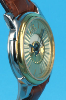 К корпусу крепится ремешок ручной выделки коричневого цвета из кожи аллигатора.