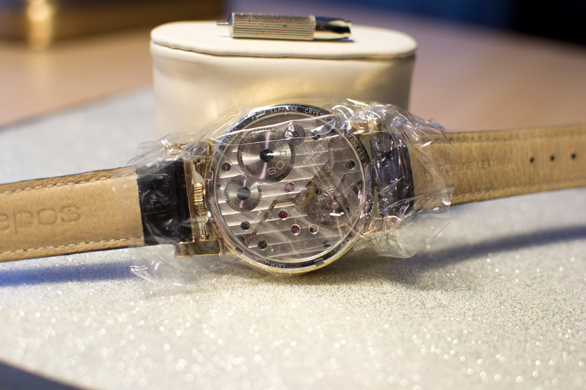 Одни из самых совершенных часов фирмы Epos. Единственные в мировом часовом ассортименте часы с большой вертикальной датой - инновация Epos. Надёжный и точный механизм Epos GDV с ручным заводом богато декорирован "женевскими полосками" Cotes de Geneve, синими воронёными винтами и гравировкой. Можно заводить и переводить дату с помощью миниатюрного ключа. Удобное расположение ЗГ сверху корпуса. Позолота 18 к 750 проба. Часы идеальны под костюм и на каждый день для человека с богатым вкусом, который желает выделиться из толпы. Абсолютно новые в плёнках!