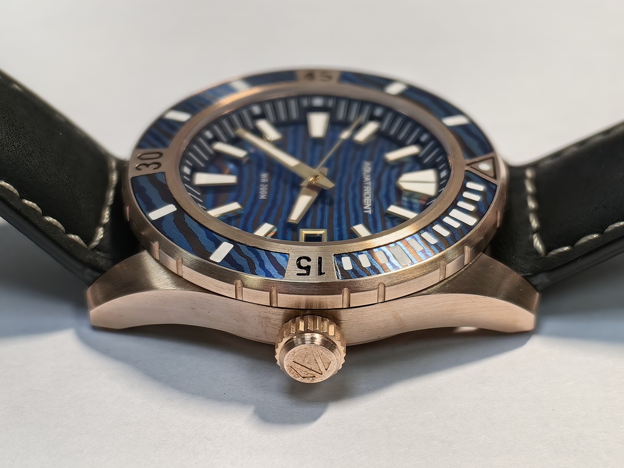Основные технические характеристики: диаметр корпуса 43мм, с заводной головкой 47мм, от ушка до ушка 51мм, между ушек 22мм, толщина корпуса 14мм. В часах установлен механизм NH35a. Корпус выполнен из бронзы, однако часы не были упакованы в пленки, и в течении как минимум десяти дней ношения намека на патину не появлялось. Из чего у меня сложилось мнение, что бронзовые детали, возможно, покрыты тонким слоем лака(такой вариант предпродажной подготовки я замечал на некоторых серебряных ювелирных изделиях), который существенно замедляет процесс патинирования, до момента активного пользования.