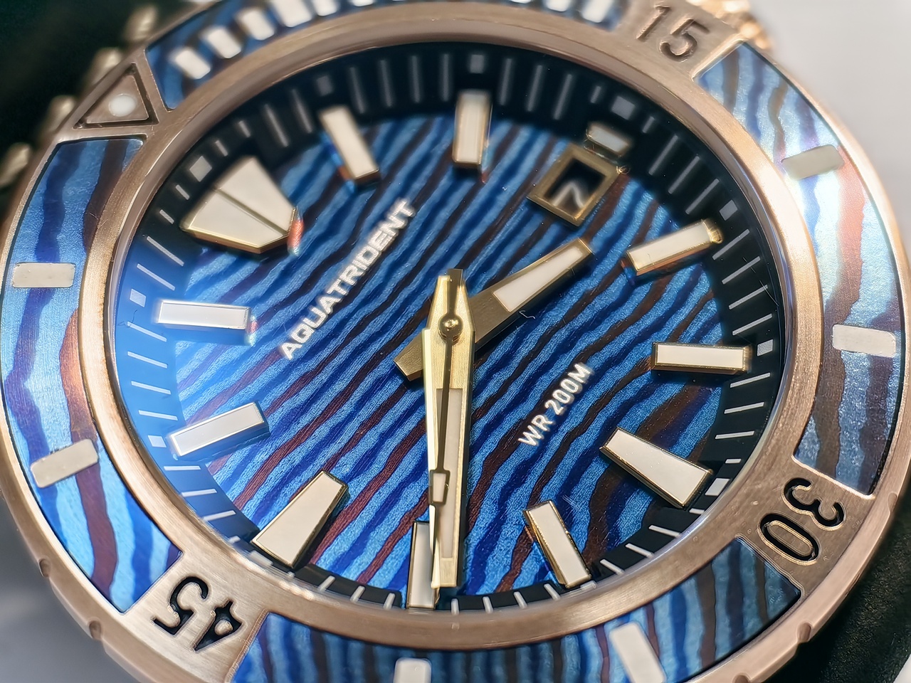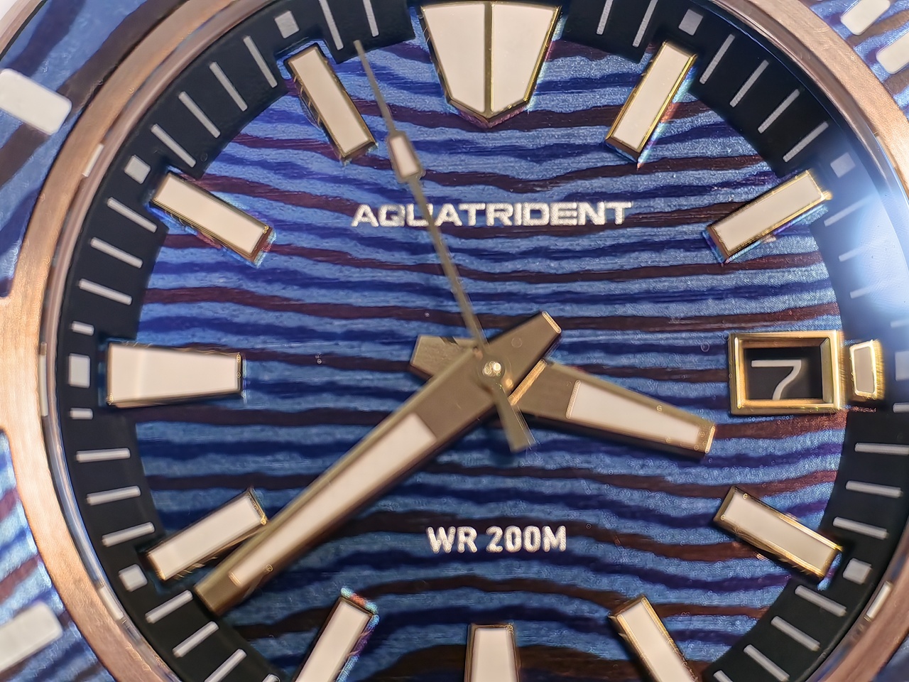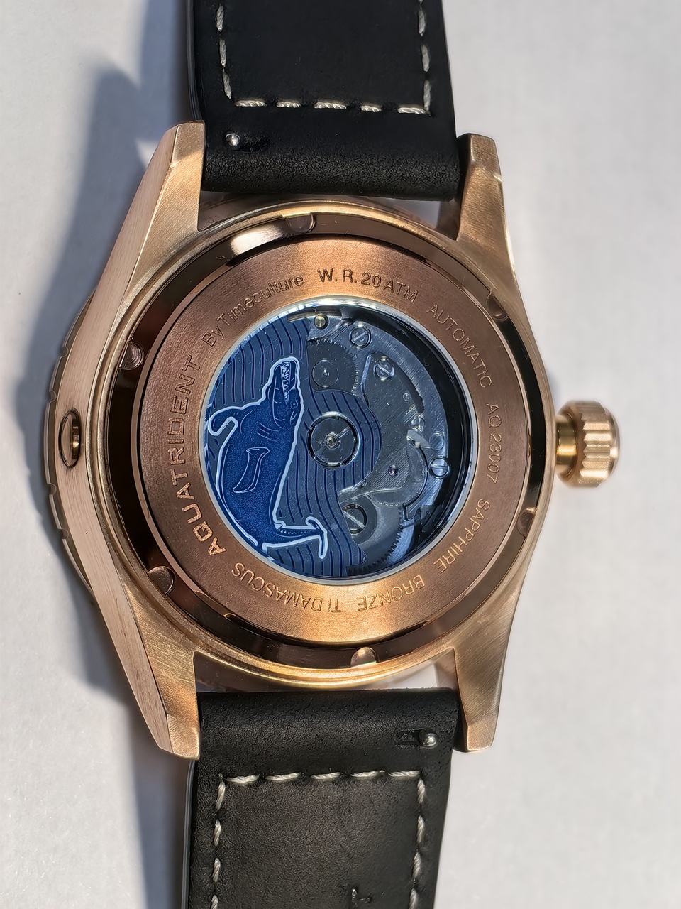 По периметру крышки выгравированы надписи: Aquatrident, By Timeculture,W.R.20 ATM, Automatic, AQ-23007, Sapphire, Bronze, Ti Damascus.
