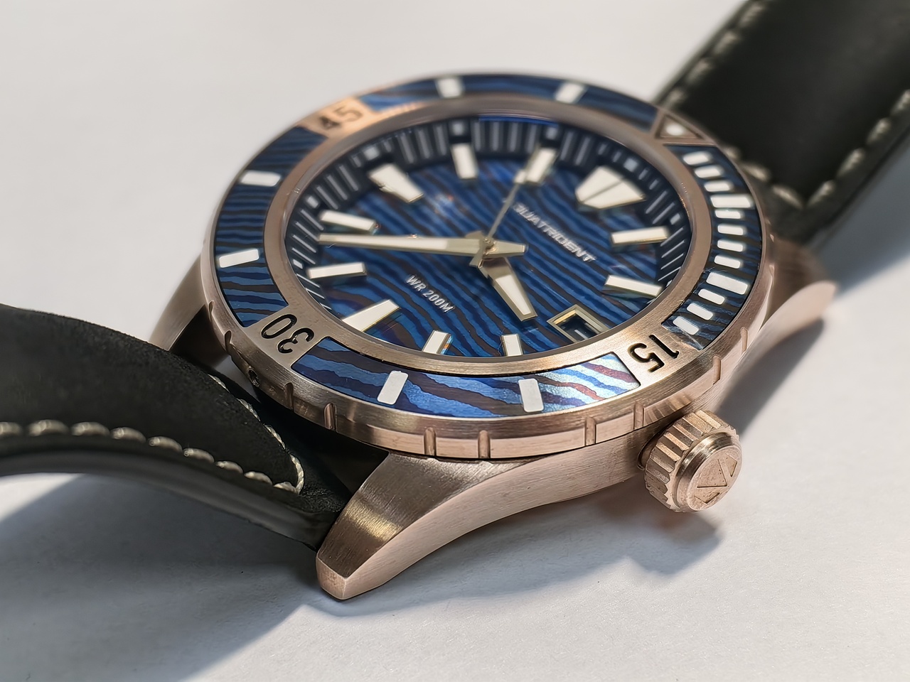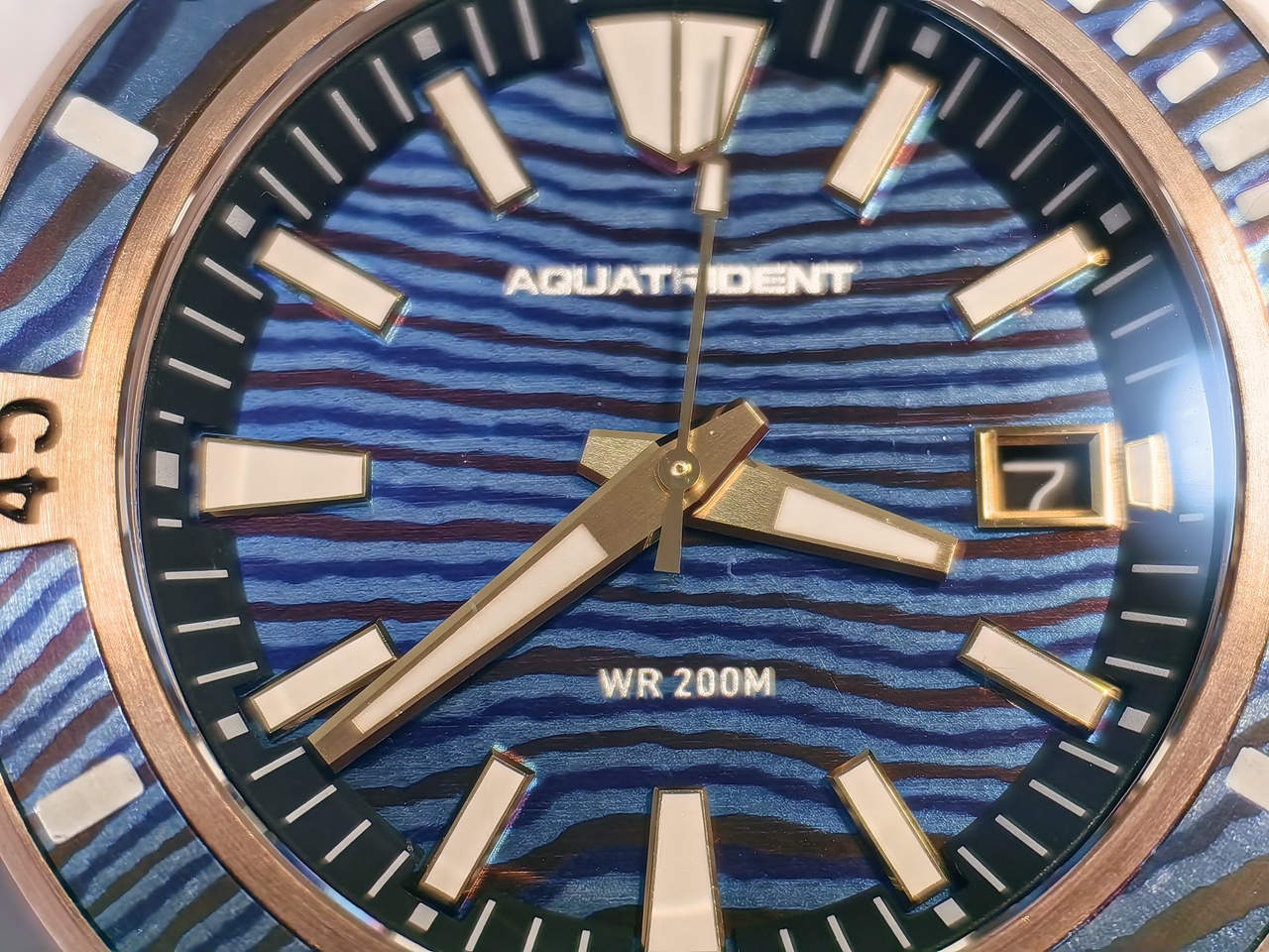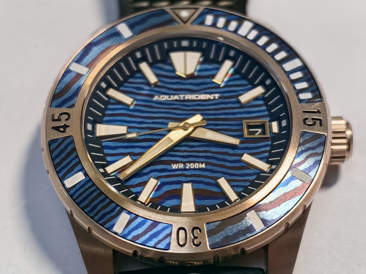 По периметру крышки выгравированы надписи: Aquatrident, By Timeculture,W.R.20 ATM, Automatic, AQ-23007, Sapphire, Bronze, Ti Damascus.
