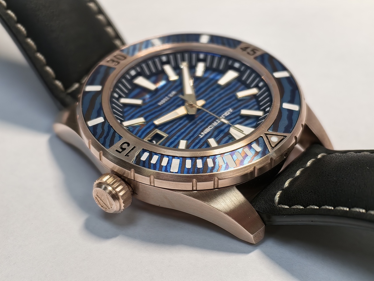 К непонятным конструктивным решениям можно отнести бронзовый автоматический гелиевый клапан. Обычно на часы с водозащитой 20 бар его не устанавливают. Кроме как коммерческой необходимостью, это решение никак не объяснить.