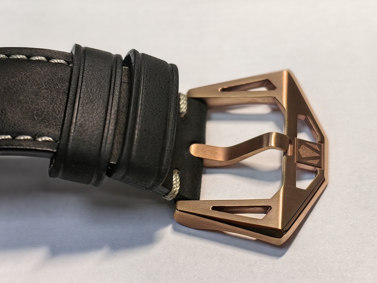 Ремешок из кожи установленный на часах, смотрится неплохо(пока новый), но он явно сделан из бюджетных материалов, так как линяет, оставляя на руке черные следы, особенно после контакта с водой, и фирменная стальная бакля деградирует его поверхность в местах постоянного соприкосновения. После двух недель эксплуатации часов, я заменил ремешок на тематический(сине-белый) текстильный и остался вполне доволен.