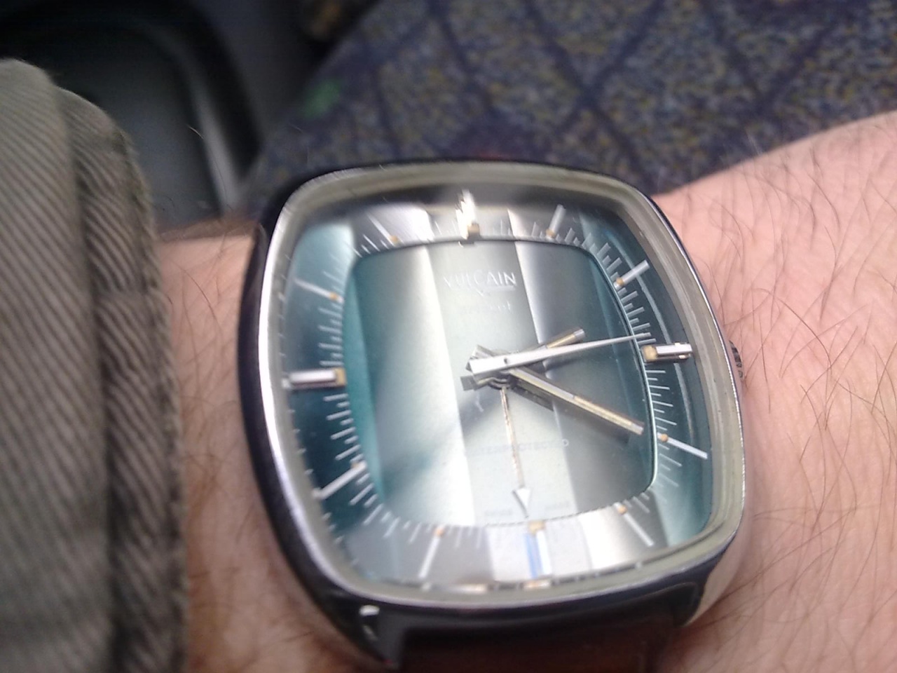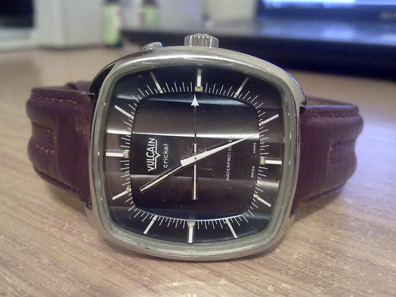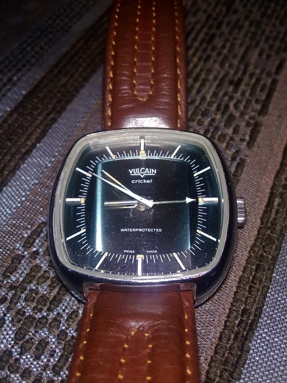 Продам (или обменяю) редкие, легендарные швейцарские часы VULCAIN CRICKET. Самый известный механический наручный будильник- мануфактурный калибр: MSR S2 -17 камней, ручной завод, 2-а барабана. Состояние отличное (за исключением, маленькой, практически незаметная царапинка на циферблате), хороший ход. Звонит Очень громко! Циферблат зеркально-полосатый хамелеон, меняет цвет в зависимости от освещения, от практически черного - темно зеленого - бирюзового, голубого-серого- с разной интенсивностью полос цвета, что довольно трудно описать, похоже на Geneve полосами. Модель в очень редком квадратном корпусе выпускались с 1969 по 1973 год
