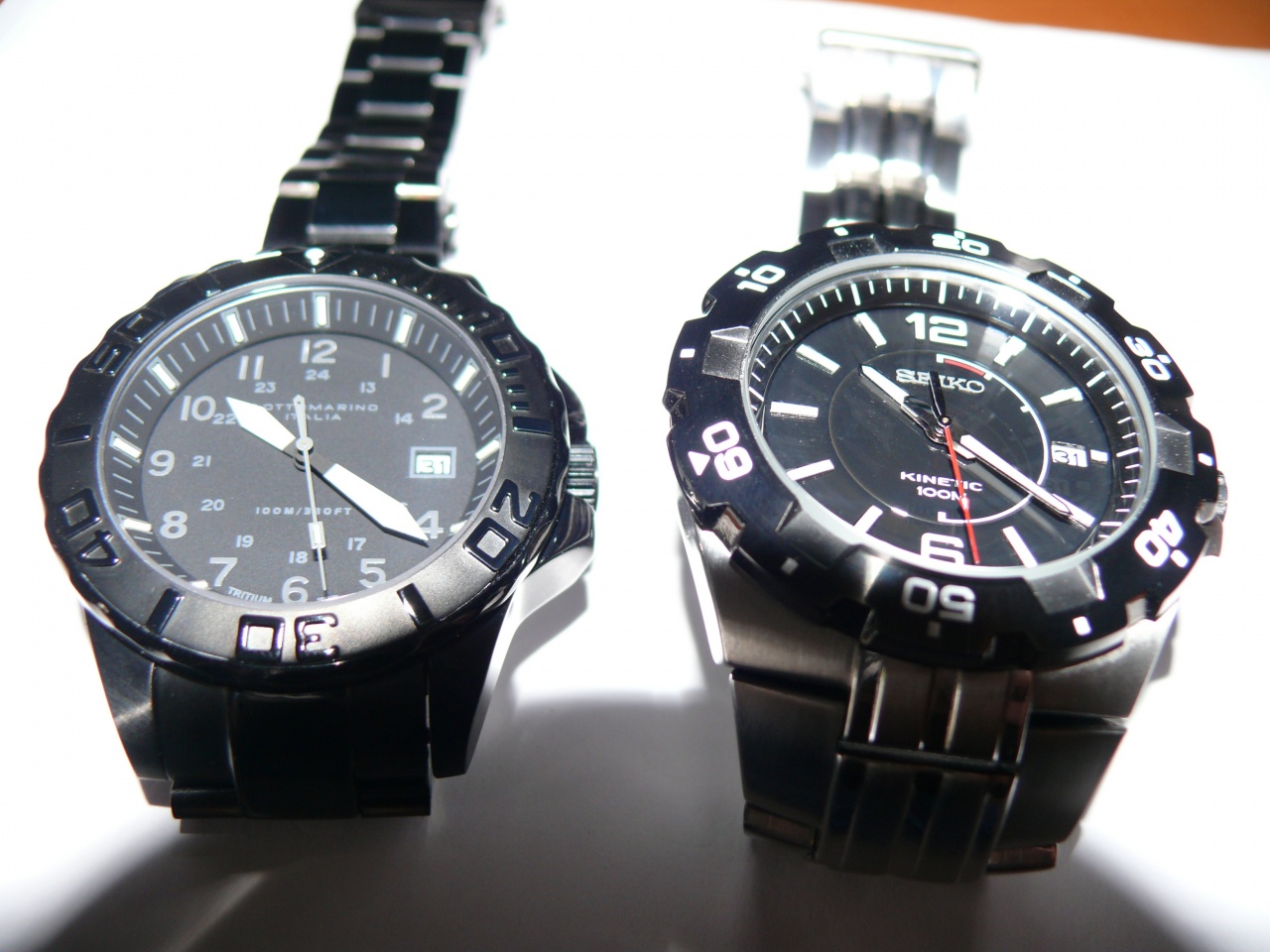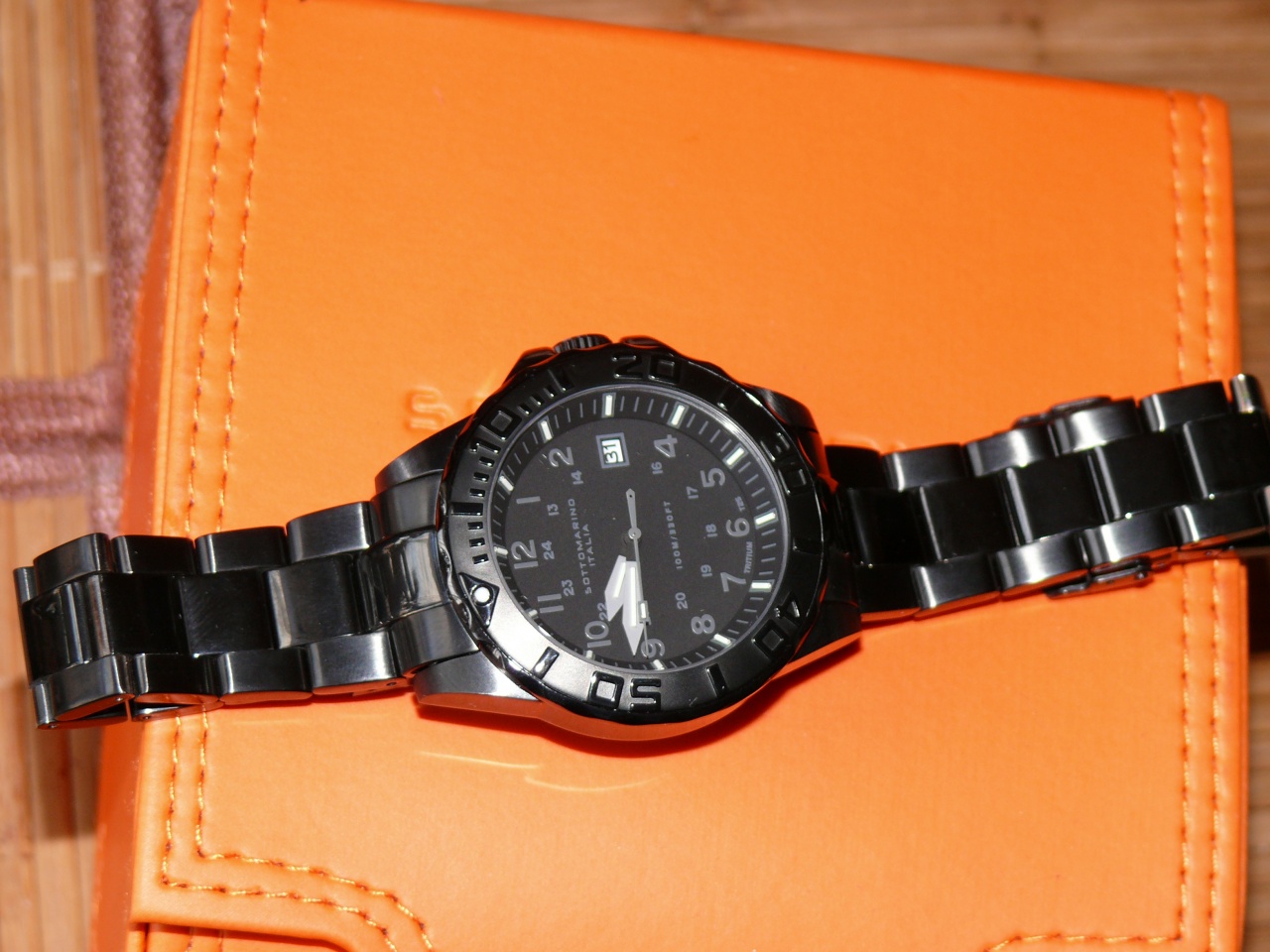 Добрый день или доброе утро всем форумчанам . Вашему вниманию хочу представить Sottomarino Lucciola с тритиевой подсветкой .Часы куплены у форумчанина , где то даже отзыв есть , хочу поделиться своими первыми впечатлениями. Часовой болезнью ранее не болел , вернее вообще не знал о существовании часов . А точнее телефон , в машине часы , в компьютере часы , везде часы.И вот как только исполнилось 40 прозрел )) Так как часы ношу не постоянно , связано с работой с красками и растворителями, то кварц основное требование.Начитавшись форума, естественно Сейко Кинетик , для меня это Тойота среди часов. Тойота для меня эталон надежности , функциональности , комфорта . По этому и Сейко )). Болезнь прогрессировала и вот уже у супруги Сейко с брюликами ))) Далее обострение и на 18 летие сына заказана Сейка спортура с будильником.потом были Раймонды , Милитаре , ну все вроде качественные часы . Ну а так как на весну совсем нет часов , да и зарплата далеко , то в глаза бросились часы неизвестной фирмы с завинчивающейся головкой ,тритиевой подсветкой ,сапфиром , вращающемся в одну сторону базелем , черным ПВД покрытием , датой ,большой секундной стрелкой , как я хотел , да еще и ценой в 150 уе, то брать или не брать вопрос не стоял .. Брать!!! Упаковка у часов неплохая , красивая оранжевая коробочка простроченная , с кнопкой . Из документов непонятные две бумажки , размером с билет на метро и шильдиком Sottomarino Lucciola.Общее впечатление от часов положительное. Стрелки четко попадают в метки. Я впервые увидел тритиевую подсветку , так как на сейко не тритий , и что могу сказать . Может я не понял что , но Сейко горит в темноте а эти не очень .. Может зарядить нужно , солнцем ) Посмотрим.На ощупь тяжелые качественные часы .Единственное что огорчило - это браслет. Браслет отвратителен во всем . В местах соединения звеньев браслета отсутствует напыление и видны , кстати сильно, желтого цвета металл . Это же присутствует и на ребрах ушек часов . Застежка браслета жидкая , фиксируется слабо .. То есть браслет напоминает то что продается во всех супермаркетах за 300 рублей. Но вообщем то часам за эту сумму простительно . Буду ставить каучук. Пока все впечатления . Позже дополню , если будет интересно Вам. Спасибо.