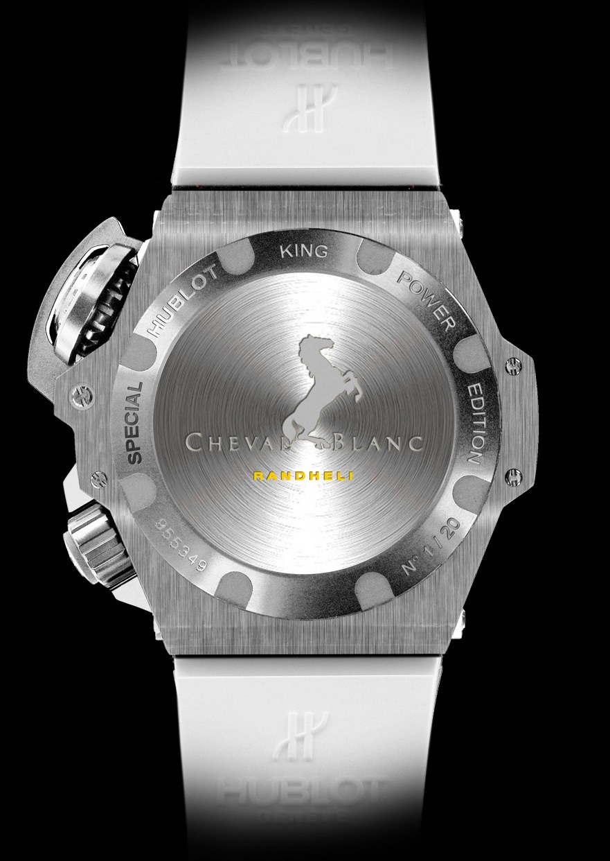 В соответствии со стандартами NIHS, часы представляют минутную шкалу с четко выделенными пятиминутными отрезками. Искусственное сапфировое стекло обладает толщиной 6,5 мм, оно обеспечивает водонепроницаемость и устойчивость к давлению. На сатинированной завинчивающейся задней крышке из титана 2 класса представлена гравировка эмблемы отеля Cheval Blanc Randheli. Головка, расположенная на 2-х часах устанавливает время погружения, а другая головка на 4-х часах служит для корректировки даты и времени. На позиции 10-ти часов расположен гелиевый клапан из нержавеющей стали, который выпускает скапливающиеся газы при достижении определенного давления. Модель дополняется белым каучуковым ремешком с застежкой-пряжкой.