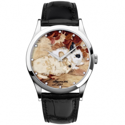Маркетри из соломки или дерева создавали несколько брендов, но больше других преуспел Patek Philippe, представивший три миниатюры с кроликами в своем классическом корпусе Calatrava с ультратонким калибром 240, оснащенным автоматическим заводом. Часы были созданы к году кролика по китайскому календарю (2011-му), но актуальными они остаются весь 12-годичный цикл, да и во все последующие циклы. Неслучайно, публике их представили с некоторым опозданием – лишь на Baselworld 2012, когда по китайскому календарю давно уже наступил год дракона.