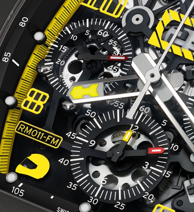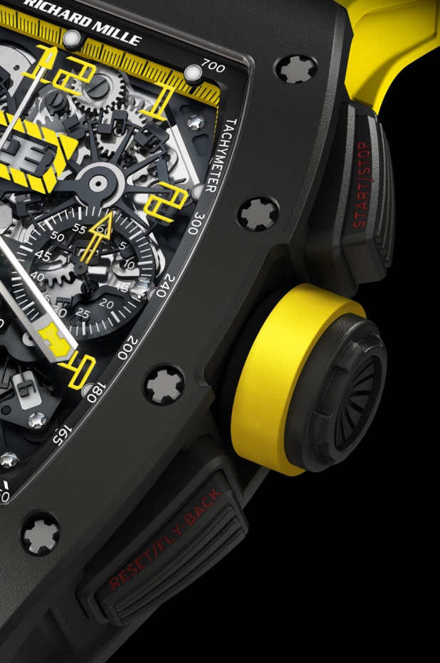 Новые часы от компании Richard Mille помимо других технических инноваций характеризуются функцией flyback-хронографа. Черный трехсторонний карбоновый корпус создает отличный контраст с ярко желтым ремешком, цифрами, стрелками, внутренним безелем, защитой головки подзавода и лакированными деталями ротора. Изображение желтого шлема на показателе 7 часов добавляет часам спортивную нотку. Корпус часов обладает размерами 50 мм х 40 мм. Часы оснащены автоматическим механизмом с подвижным ротором. К функциям модели можно отнести 60-минутный таймер, 12-часовой счетчик, ежегодный календарь, крупные индикаторы даты и месяца.