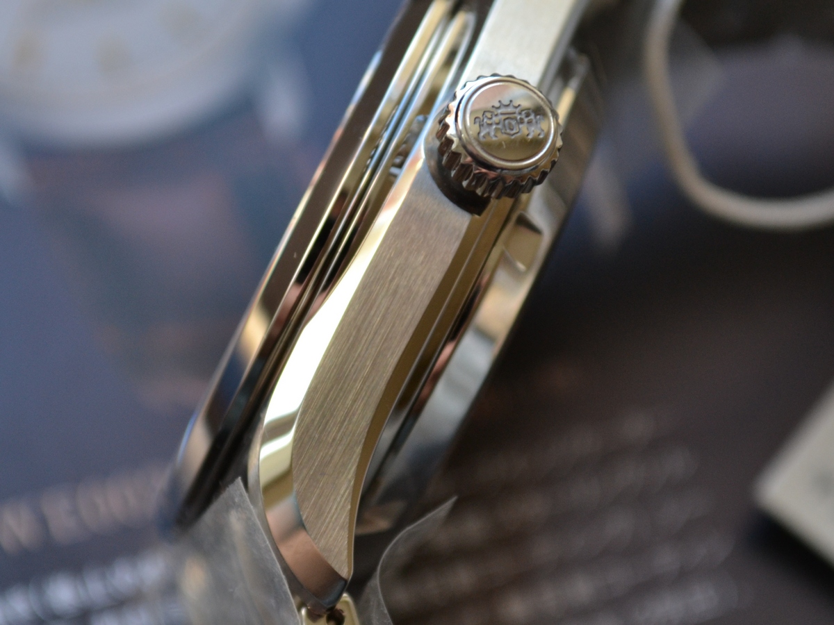 Отмечу сложную полировку корпуса и стрелок, идея матовый-глянец смотрится хорошо. И если сбоку часы вы будете смотреть редко, то стрелки сияющие с торцов и матовые в центре напомнят о себе при каждом взгляде на часы. Также очень узкое отверствие в циферблате, через которое установлены стрелки, его почти не видно.