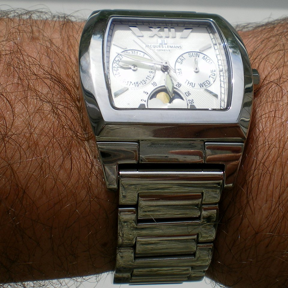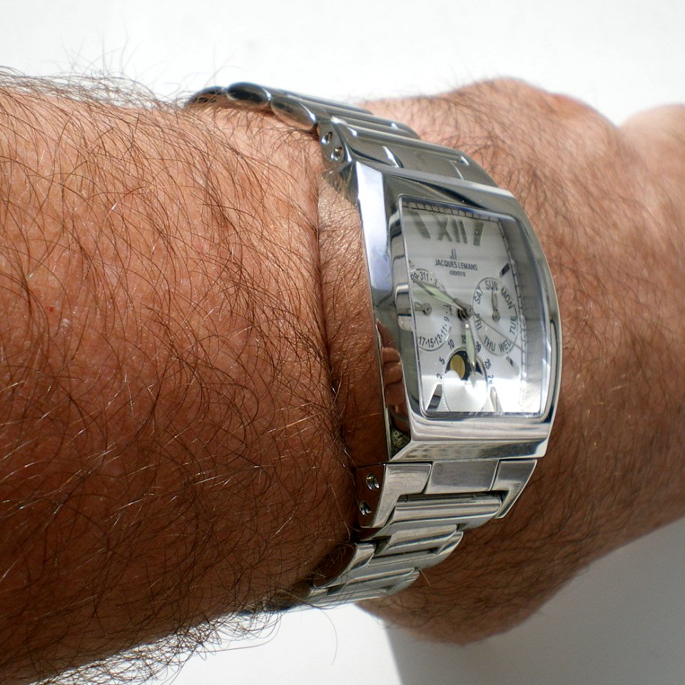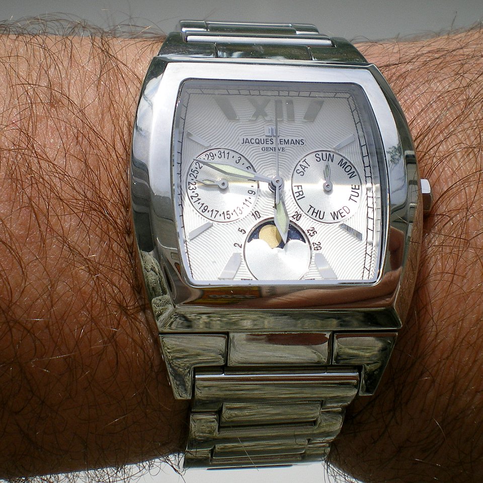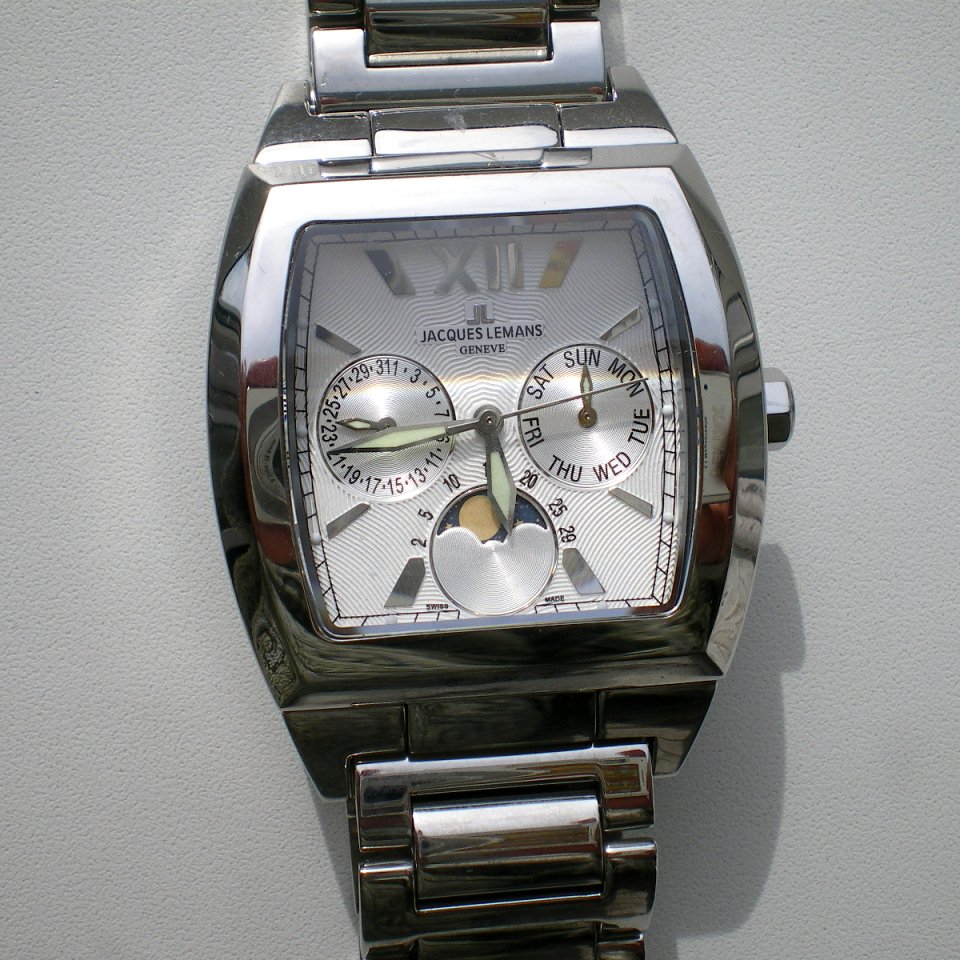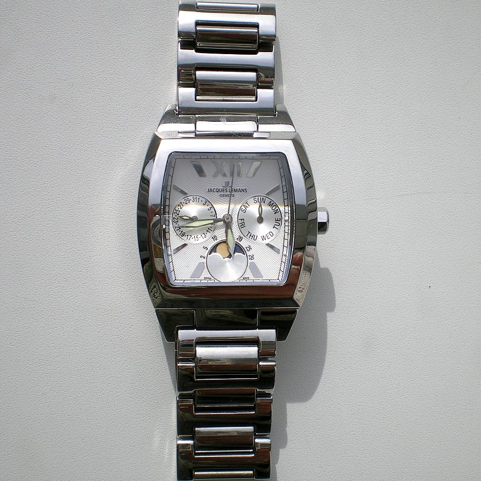 Вашему вниманию предлагаются часы Jacques Lemans из коллекции Geneve, модель G122 на металлическом браслете. Модель целиком выполнена из полированной нержавеющей стали 316L и работает на усложненном механизме, который помимо обычных указателей даты и дня недели содержит индикатор фаз Луны (не путайте с более распространенным, простым и дешевым указателем «день-ночь»!). Часы породистые, причем видно это издалека. О надежности и швейцарском качестве часов Jacques Lemans Geneve уже сказано, повторяться не буду.