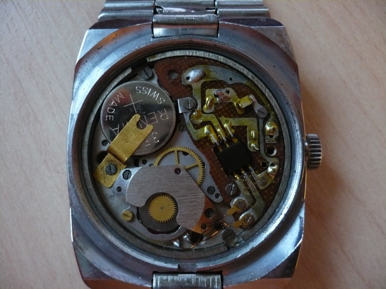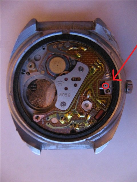 Как видно на фото в механизме часов Слава отсутствует подстроечный конденсатор, как например у кварцевой Ракеты (на красную стрелку не обращайте внимания) или Электрониках тех лет. Или все-таки он есть, под платой или за цифером? Кварцевый резонатор также не виден, скорее всего под платой. Аналогичный кварцевый калибр есть и у Полёта.