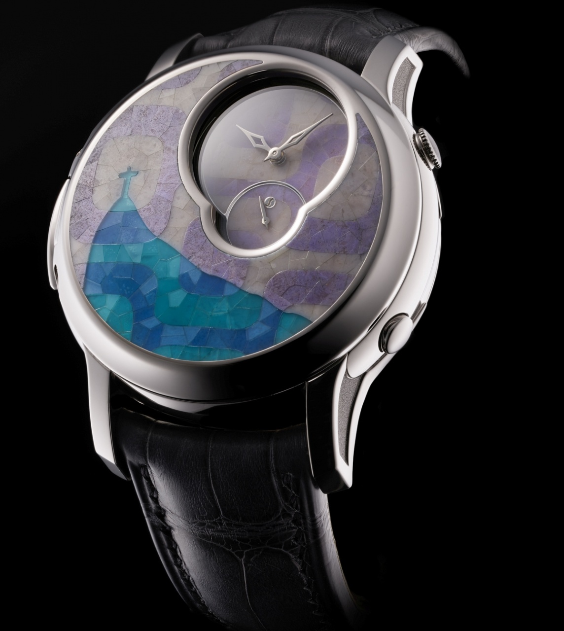 Круглый полированный корпус новинки, изготовленный из 18-каратного белого золота, диаметром 43,0 мм, толщиной 15,0 мм, водонепроницаемый до 30 метров. Лицевую сторону корпуса покрывает (кроме отверстий для субциферблатов) откидная крышка, на которой имеется изображение Рио-де-Жанейро (в том числе знаменитой статуи Христа Спасителя на горе Corcovado и набережной у пляжа Ipanema), выполненное в модернистском стиле и в технике микро-маркетри. Для этого использовано 352, зеркально полированных, миниатюрных плиток, вырезанных лазером, из нефрита (270 плиток) и агата (82 плитки) - каждый толщиной 0,5 мм (создание картины потребовало три месяца кропотливой ручной работы, которую выполнили специалисты женевского ателье Olivier Vaucher). Рифленая головка для установки времени расположена на 2 часах, пушер для завода калибра - на 9 часах, кнопка для разблокировки крышки на передней стороне корпуса - на 4 часах. Сапфировое стекло установлено на передней стороне часового корпуса и на его завинчивающейся задней крышке.