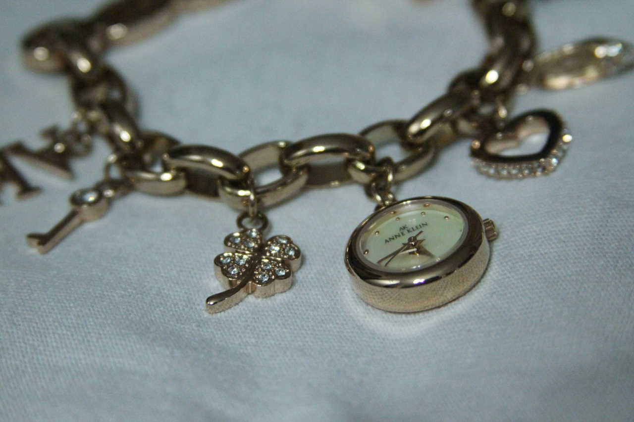 Продаю fashion-часы американского бренда Anne Klein, модель 7604 Charm (линейка Time to Charm). Сапфировое стекло, позолота с защитным покрытием, швейцарский кварцевый механизм (Ronda 753), 6 подвесочек с кристаллами Swarovski - лого АК, ключик, клевер, сердце, туфелька и сумочка.
