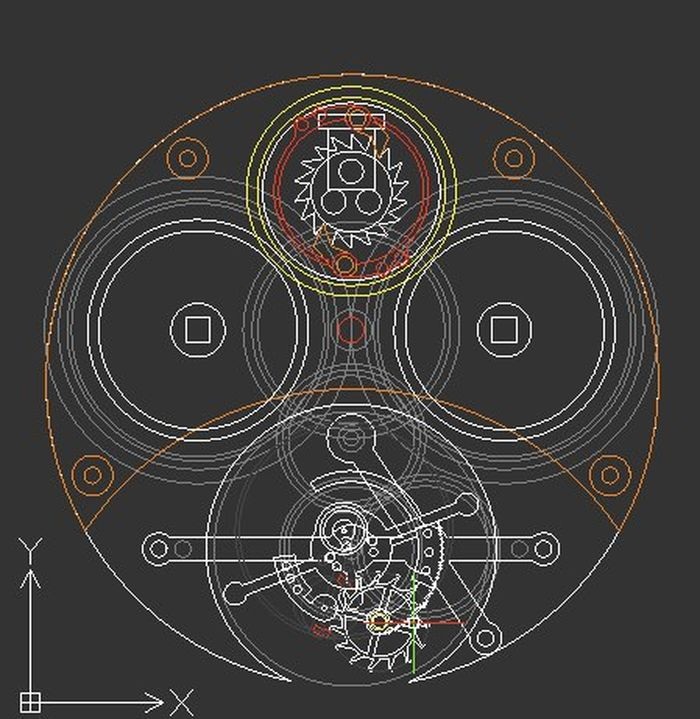 Но самое главное заключается в том, что Валентин Ерофеев не просто переделывает старые механизмы и вставляет их в новые корпуса, у него полным ходом идет работа над собственным турбийоном. Первые чертежи калибра, уже можно посмотреть. Например, анкер с цилиндрическими палетами.
