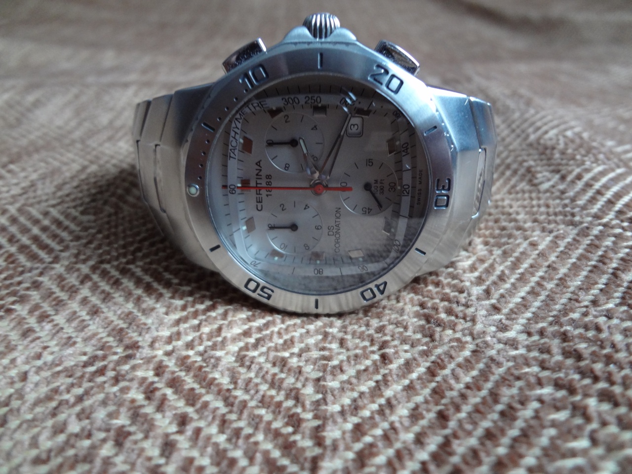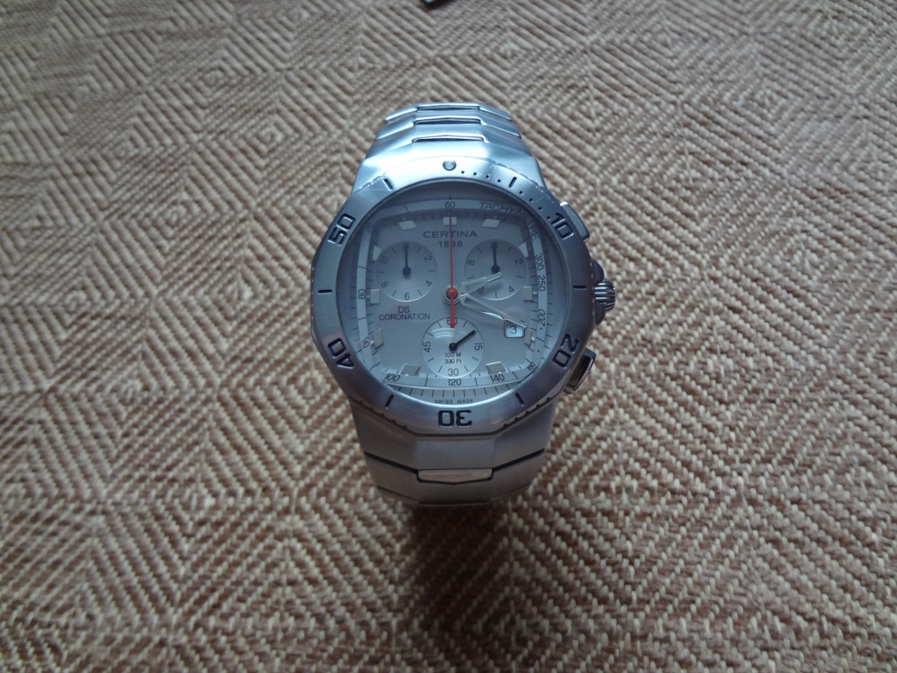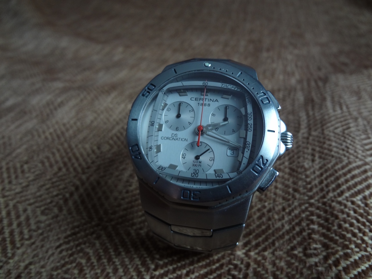 Продаю часы Certina Coronation (кварцевые). Корпус - стальной, стекло -сапфировое, WR-100 метров, система DS (Double Security) с завинчивающейся заводной головкой. Хронограф/ Дата/ Секундная стрелка. В комплекте фирменная коробка Certina, руководство по эксплуатации и гарантийная карточка. Часы массивные мужские, носились мало, повреждений не имеют. Продам за 10 тыс руб.
