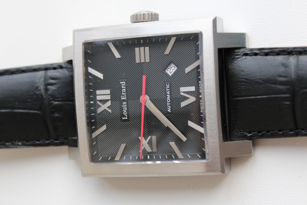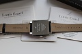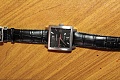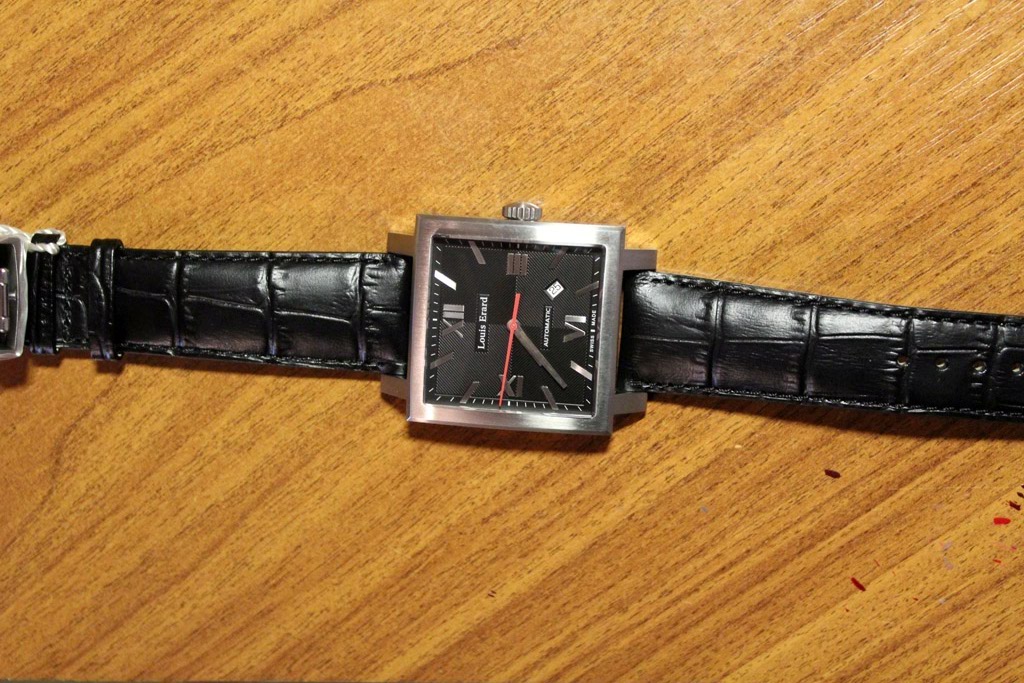 От себя: очень интересный циферблат, меняющий цвет от черного к темно-серому при изменении гаклона источника света. Базель стальной, выглядит внушительно. Ремешок кожаный, удобный, плотный. Ниже фотографии продаваемого экземпляра. Внутренняя сторона часов в пленке.