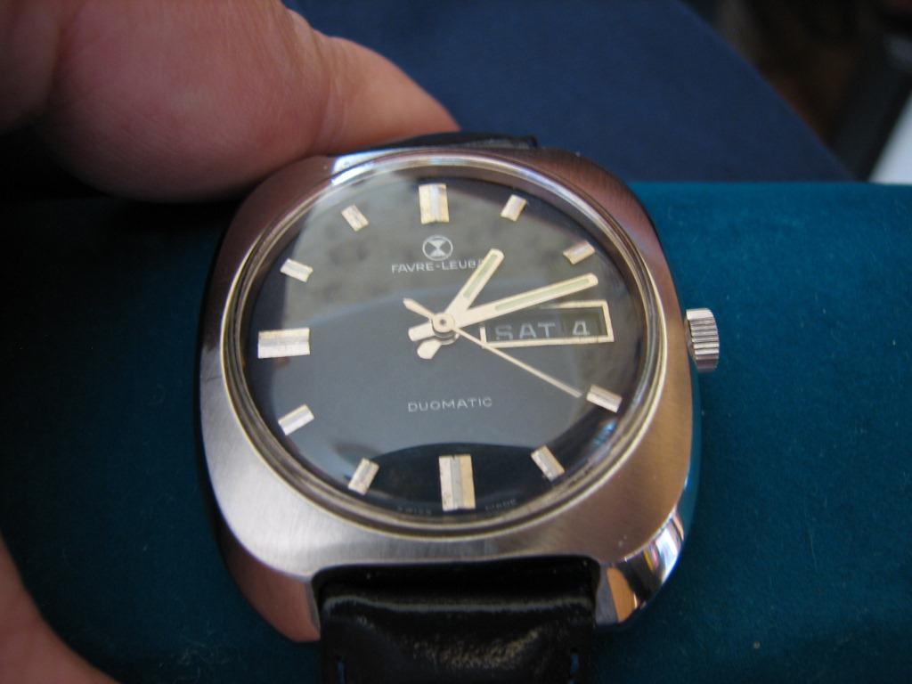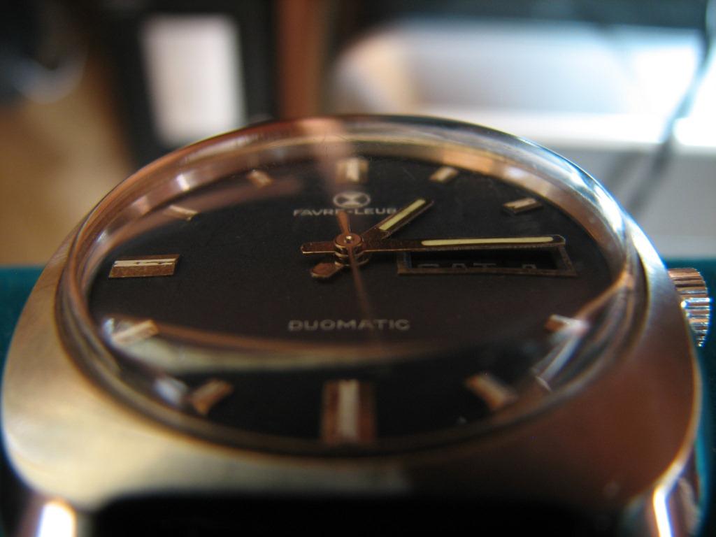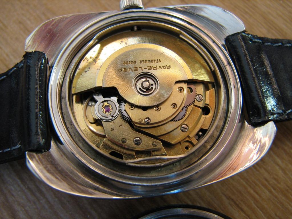 FHF, с двойным барабаном (Duomatic), 17 камней, автоподзавод + ручной завод, день недели, дата. К часам прилагается темно-серо-синий кожаный ремешок, очень органично, сочетающийся с цветом циферблата - темно-серо-синей бархатистой фактуры. Часы обслужены, ход точный. В связи с возрастом, имеются царапины на корпусе, а также, на циферблате – малозаметное темное пятнышко в районе полседьмого (на фото видно).