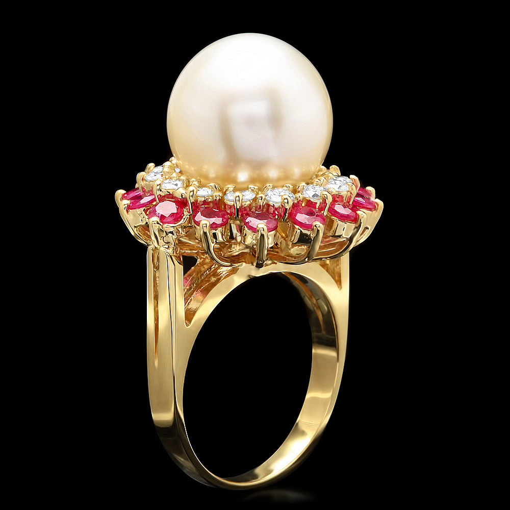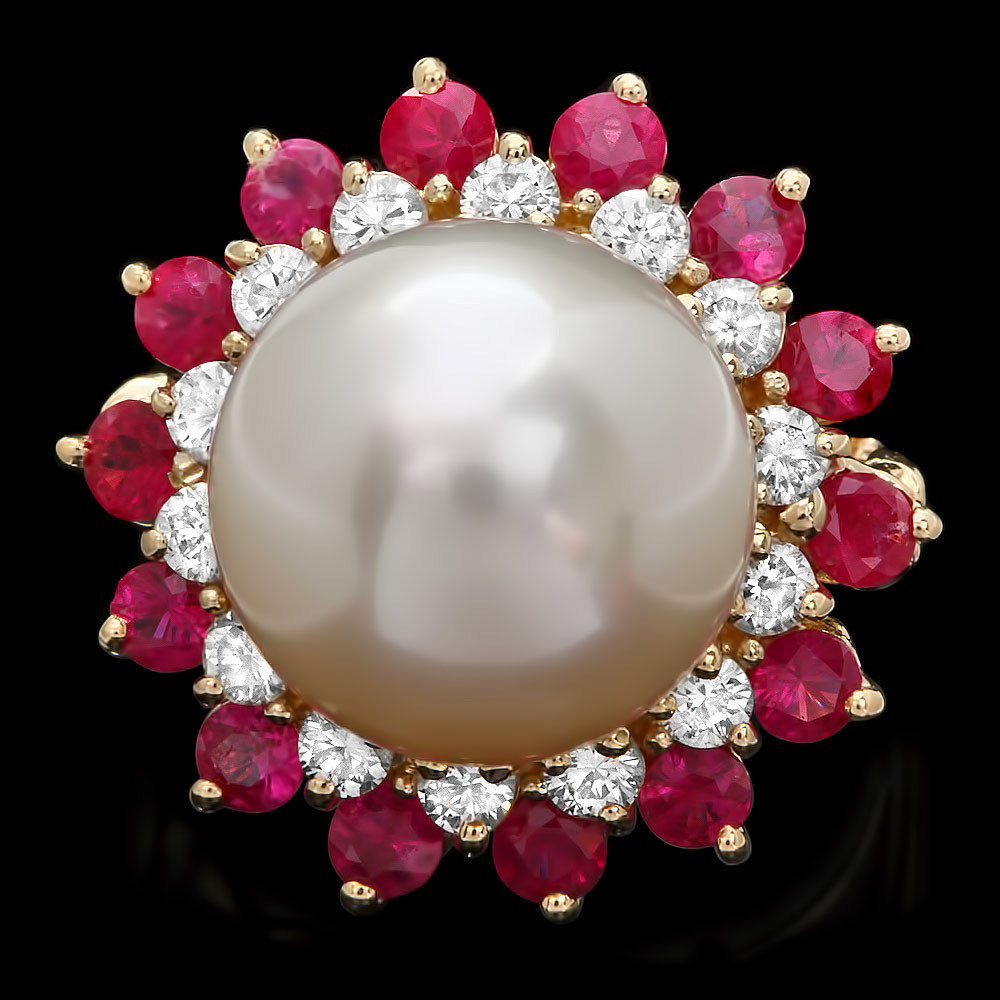 Украшено белой жемчужиной d=13mm, бриллиантами на 0,8ct (цвет H-I, чистота SI1-SI2) и 14 рубинами на 1,5ct.