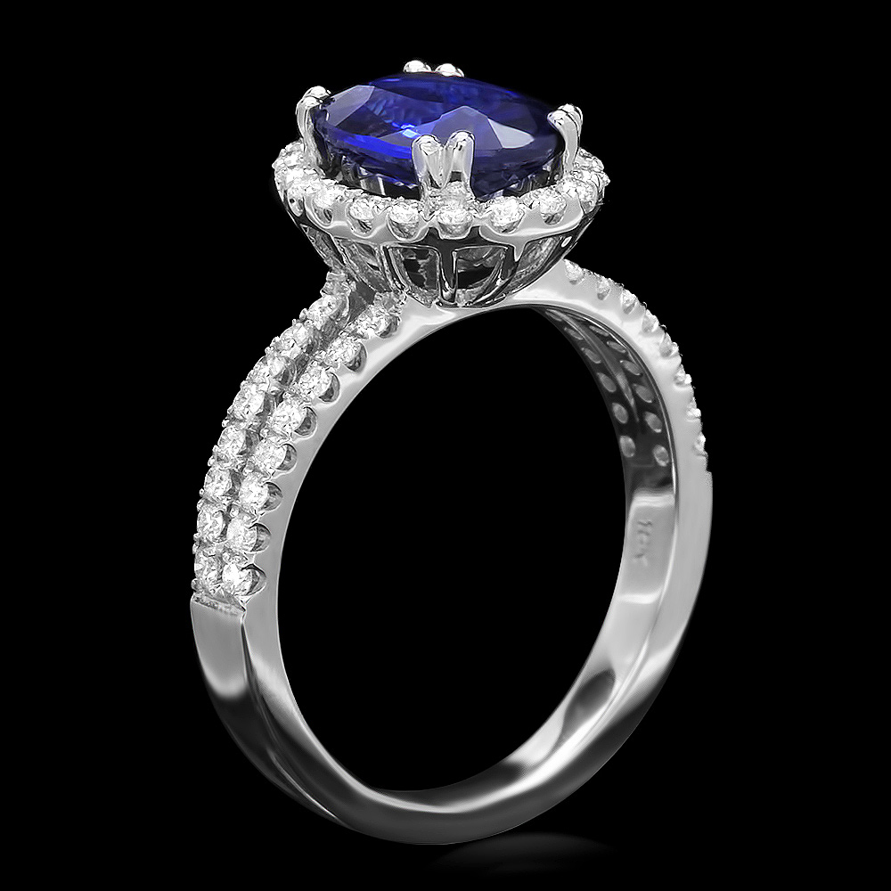 Это кольцо прекрасной работы из белого золота с натуральным сапфиром весом в 2,0 карата в окружении чистых белых 20 бриллиантов на 0,5 карата.