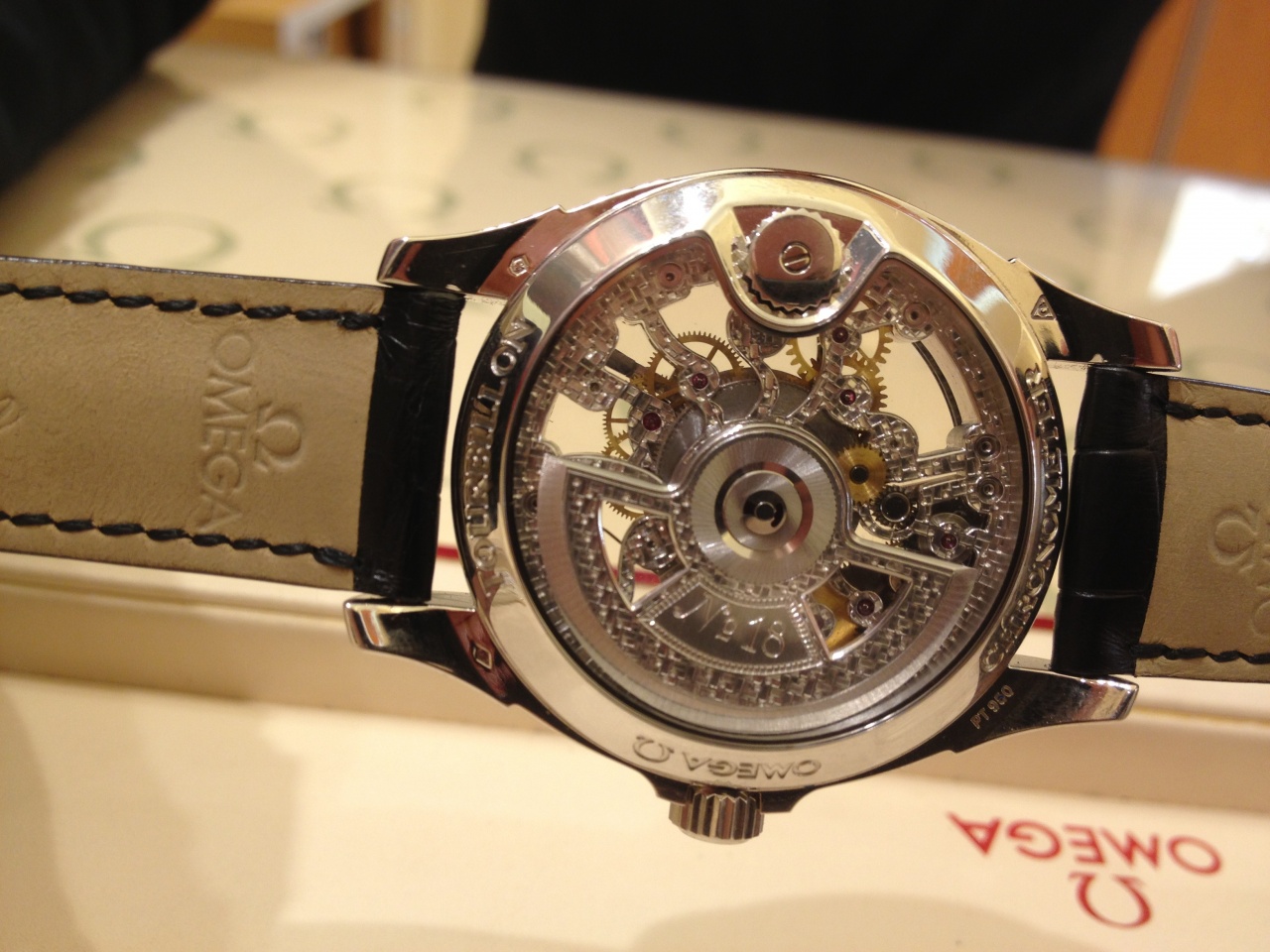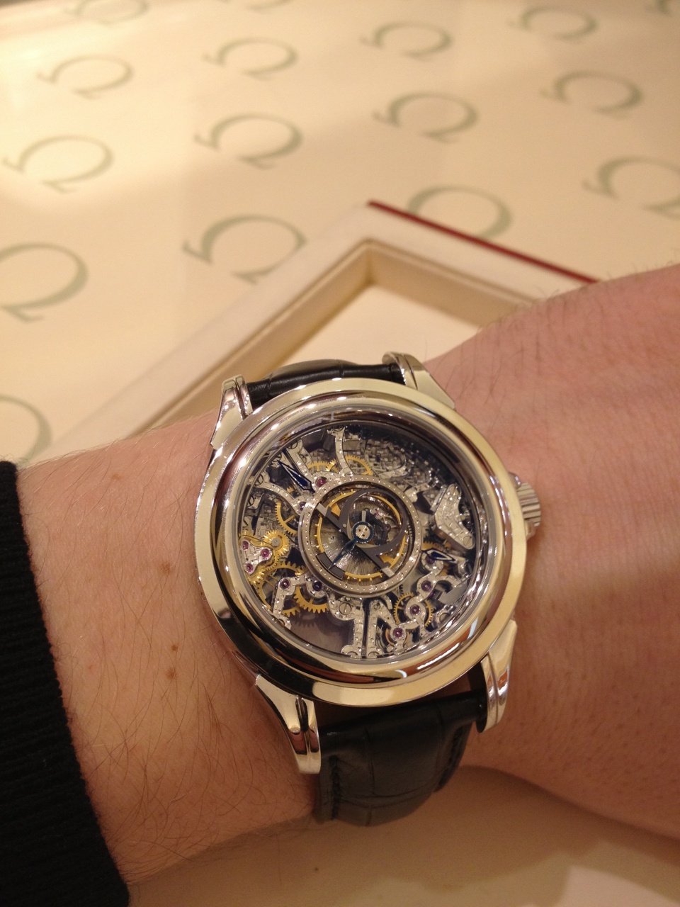 Повод был банальным - подарок жене на ДР (о чем планирую отдельный фотоотчет, благо есть что небанальное показать из результатов). Пока жена отлучилась "буквально на пять минут" (с) по другим не менее интересным местам славного города, я, как мог, устанавливал приятные контакты с персоналом магазина для выбивания более приятной скидки. Когда всё кофе был выпит, все цифры посчитаны, приятная барышня предложила мне взглянуть на нечто новое, что совсем недавно поступило к ним в магазин - на скелетонированную Омегу с турбийоном.
