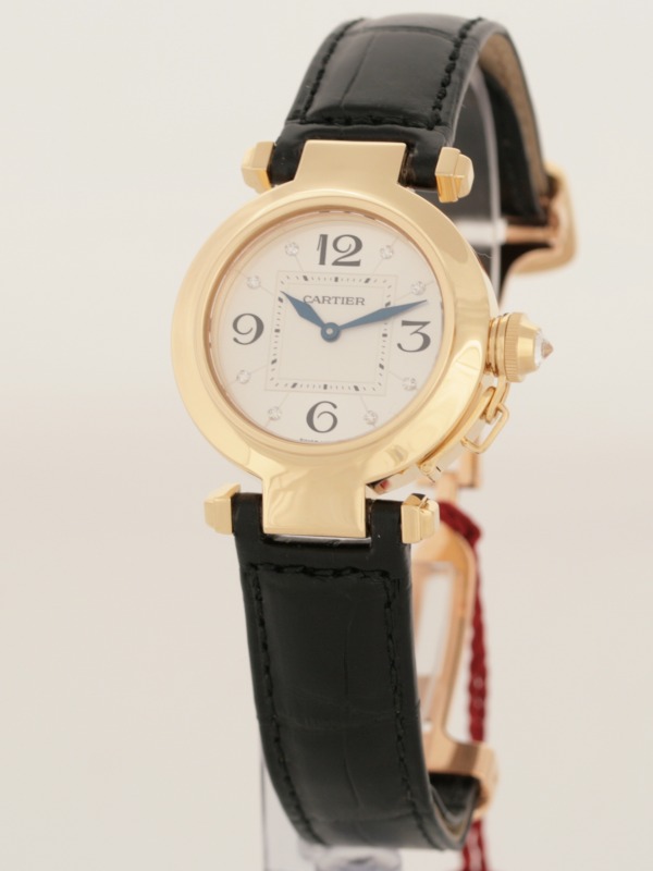 Продам часы Cartier Pasha (ref. vj11891j-1) новые, очень красивые. Выполнены из желтого золота 750 пр.(18 кар), циферблат украшен бриллиантами. Диаметр-32 мм. Ремешок черный кожаный. Безель фиксируется клипсой. В коробке, со всеми необходимыми документами. Дополнительный черный сатиновый ремешок в комплекте.