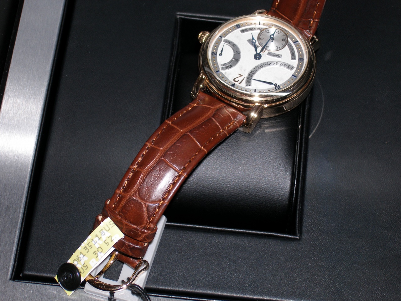 Часы массивные, диаметром 43,5 мм, корпус и застежка ремня- целиком из розового золота. Довольно интересный механизм, с ретроградными указателями, запаса хода и числа. Ручной завод.