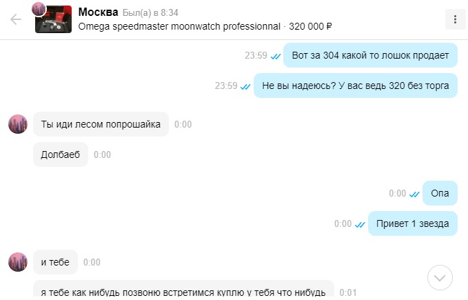 Хочу предупредить уважаемую публику о негативном опыте общения с данным персонажем. Общение с самого начала натянутое и нагловатое. В разговоре давит, занимается демагогией, искажением или преувеличением фактов в свою сторону. После пары вопросов по торгу начал открыто хамить, далее дошло до прямых матерных оскорблений в мой адрес. После чего написал, а потом и позвонил позно ночью мне с оскорблениями и угрозами физической расправы. Решайте сами стоит ли у такого персонажа покупать часы. Я уверен, что человек подобной конституции очень далек от людей на этом ресурсе и в целом от такого увлечения как часы. В случае необходимости, готов предоставить переписку и запись разговора. Берегите нервы. Если не тот раздел извиняюсь, не готов много времени тратить на данную ситуацию